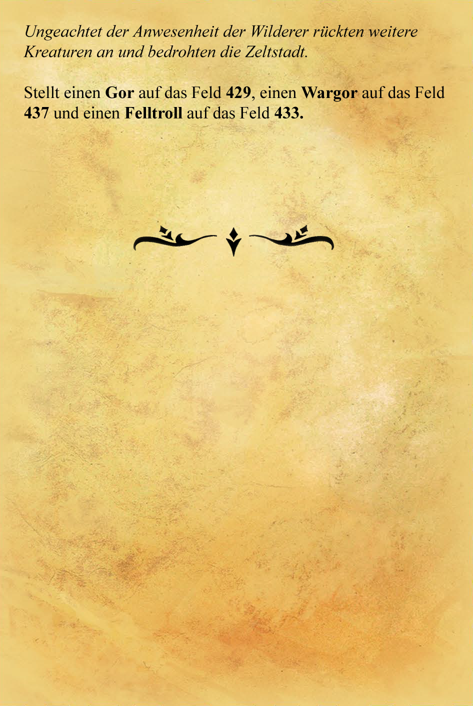 - Barz wanderte bis zum Knochenturm auf Feld 450 (7.h) und rettete den Hornfalken vor den Wilderern. Mit dem Fernrohr erspähte er auf Feld 449 ebenfalls Blaubachbeeren und auf 451 Brennholz. Dann schickte er das Fernrohr an Kram, der von seinem Feld aus den Schnee absuchte: Auf den Feldern 408 und 411 sah er jeweils 1 Schneesturm und auf 412 1x rotes Blutkraut.