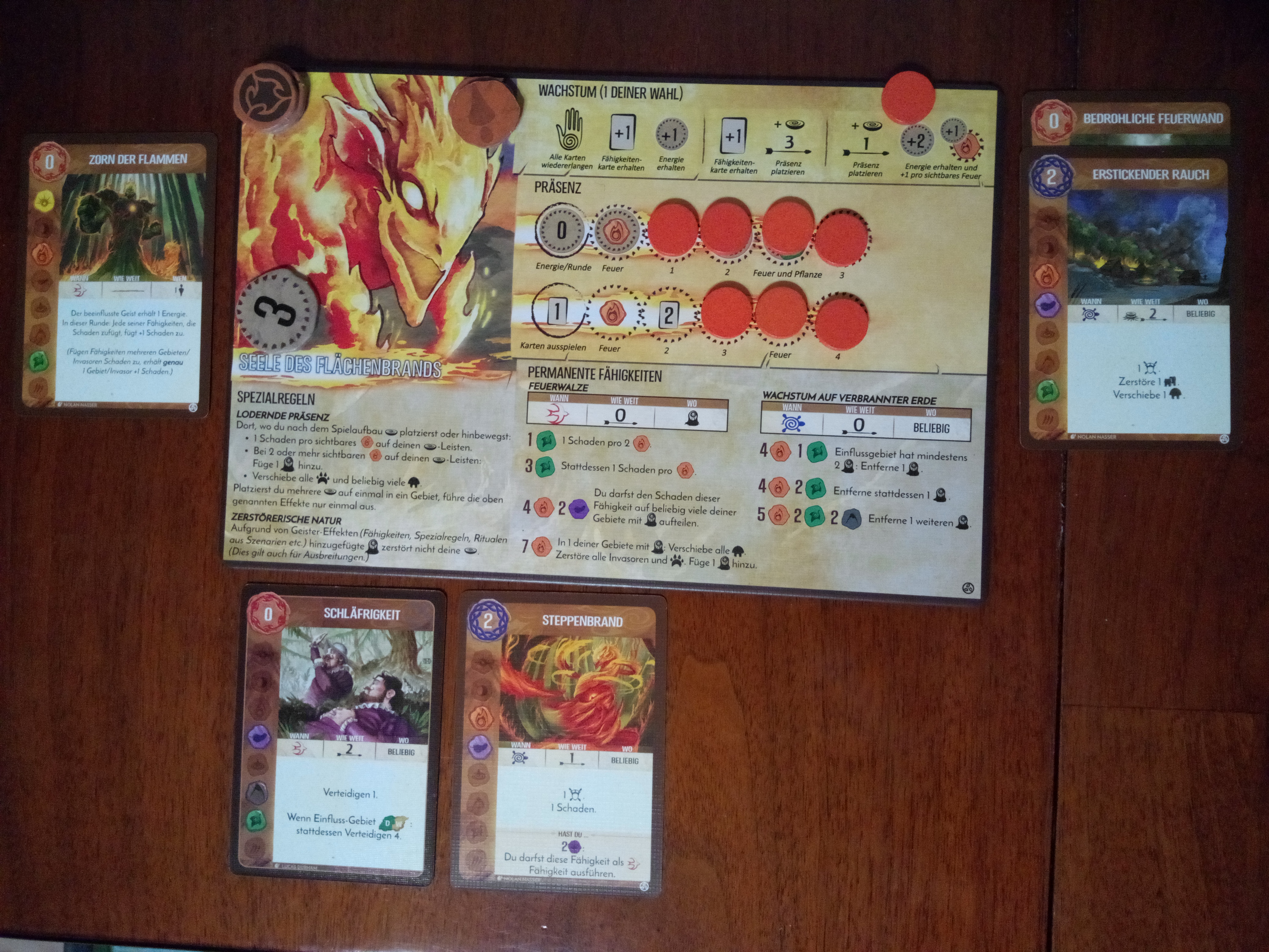 Bezüglich des Wachstums: Die Tagessplitter haben auf jeden Fall noch nicht bezahlt für den Angriff im Morgengrauen, d. h. sie verlieren noch 3 Energie (dann sollten sie für alles bezahlt haben.). Außerdem meine ich dass 2 Präsenzen von der unteren Leiste auf die obere gesetzt werden müssten, d.h. sie verlieren noch mal eine Energie. Sie müssten also nach der Wachstumsphase 2 Präsenzen weniger unten unten und dafür 2 mehr oben und 4 Energie weniger als auf deinem Bild haben. Außerdem müsste Angriff im Morgengrauen noch in der schnellen Phase ausgeführt werden (s. o.), was einiges an Furcht erzeugt und auch das Wüten in dem Küstendschungel verhindert.