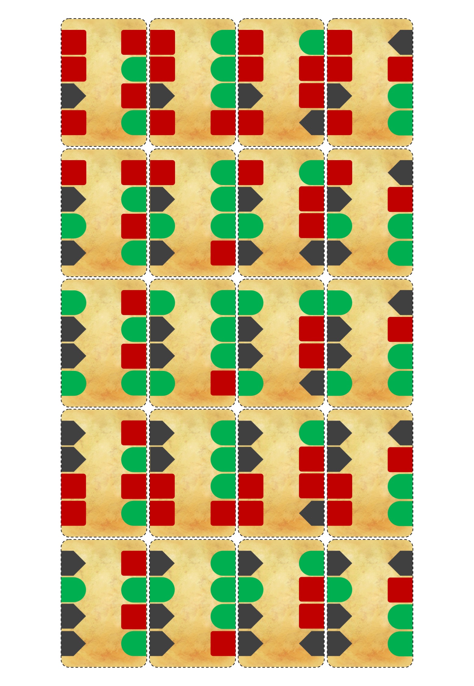 Alle 4 Karten derselben Zeile haben dieselbe Farbenreihe am linken Rand und alle 5 Karten derselben Spalte haben dieselbe Farbenreihe am rechten Rand.