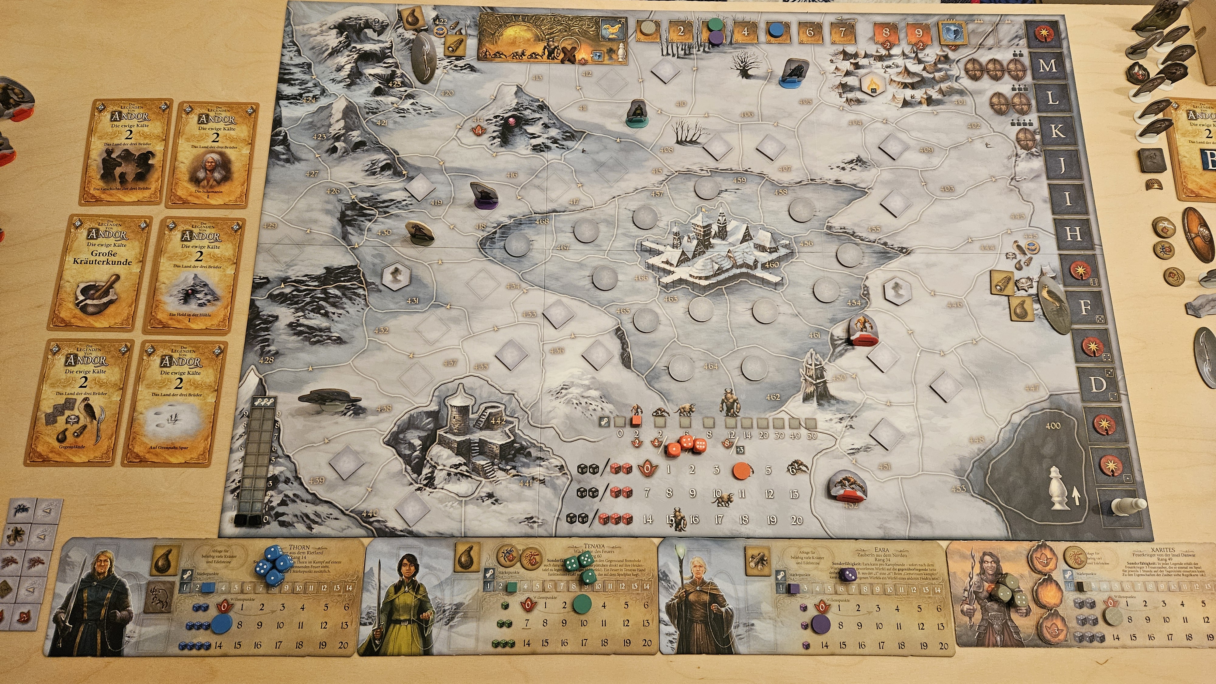Wir dürfen die Höhle (414) nur betreten, wenn wir mindestens 14 WP haben. Und bei den Eisplättchen muss ein Held, der eines betritt, seine Bewegung beenden und das Plättchen aktivieren. Anders als bei den Schneeplättchen, wo Helden vorbeilaufen können.