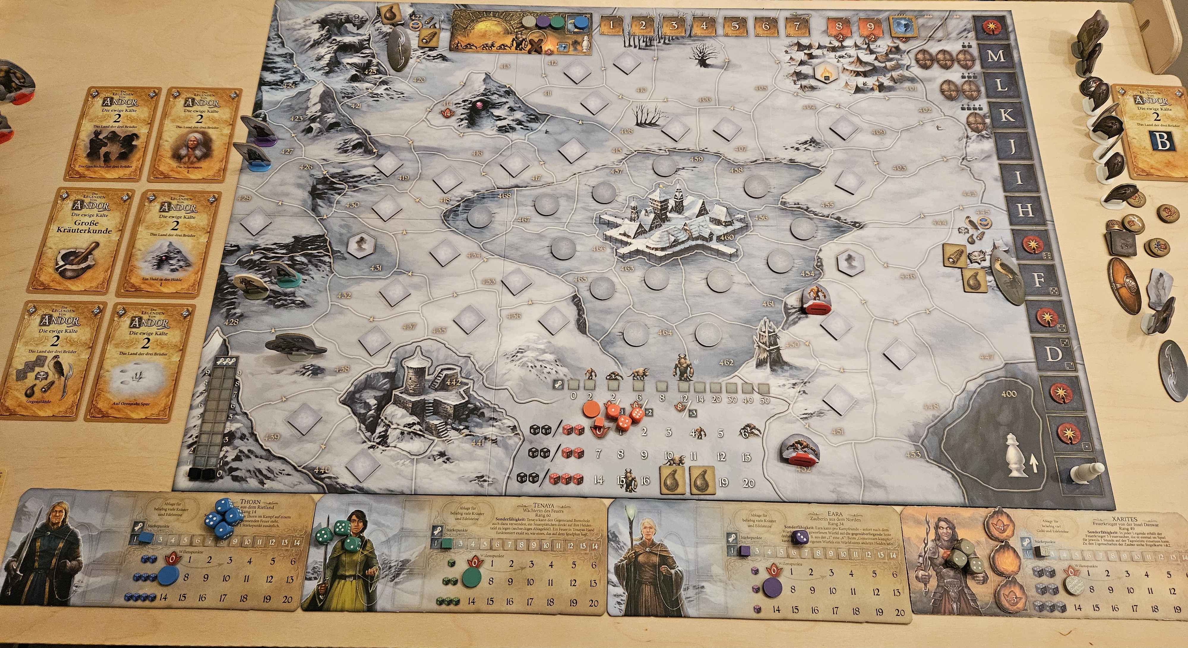 Wir dürfen die Höhle (414) nur betreten, wenn wir mindestens 14 WP haben. Und bei den Eisplättchen muss ein Held, der eines betritt, seine Bewegung beenden und das Plättchen aktivieren. Anders als bei den Schneeplättchen, wo Helden vorbeilaufen können.