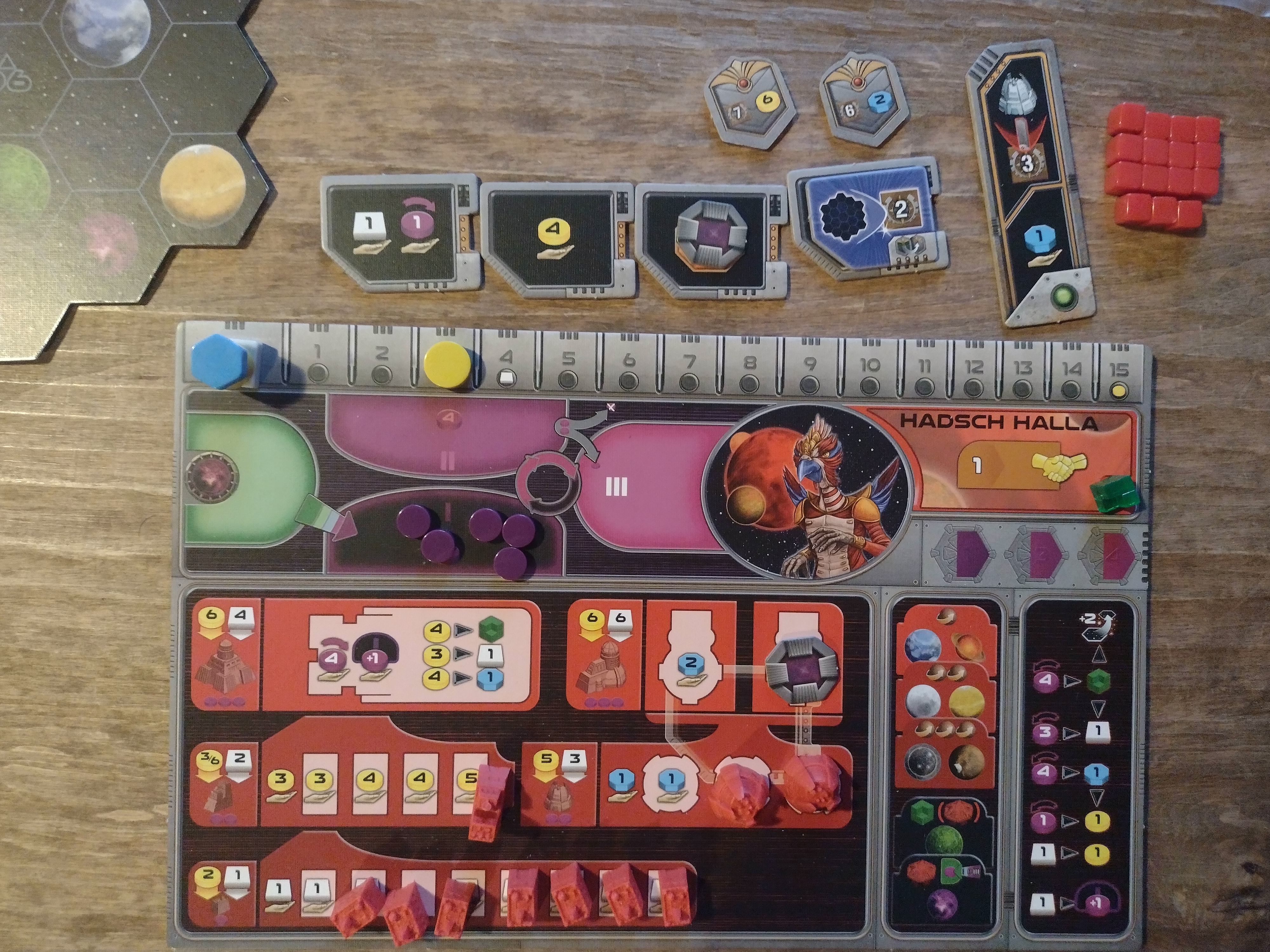 Ich kam gestern Abend zu einer zweiten Partie Gaia-Project HH vs Taklons(Standard), und wollte dieses Mal eine andere Strategie ausprobieren, wo ich mehr auf Wissen gegangen bin.