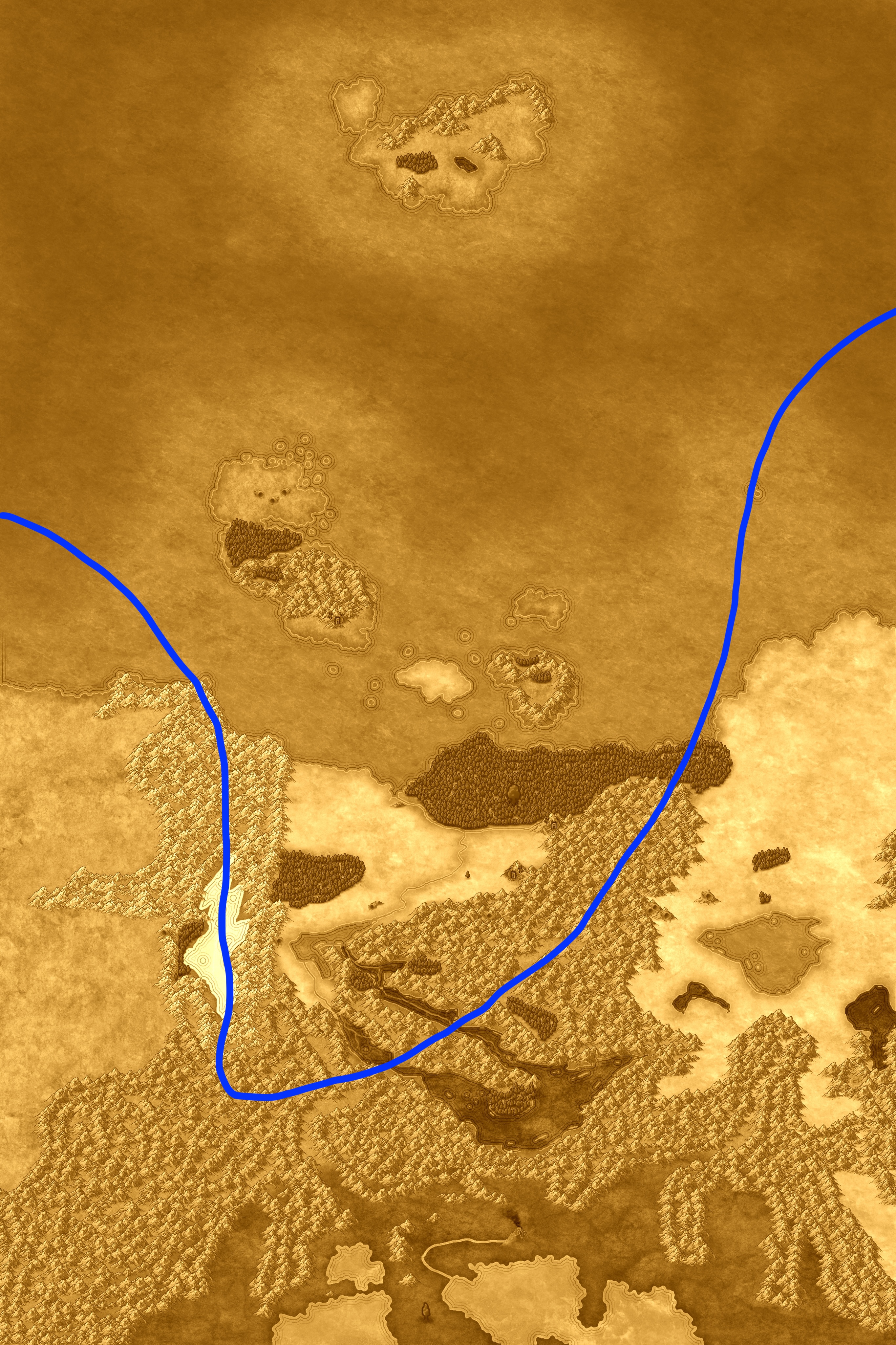 ● Ein bisschen kreativer und potentiell kontroverser ging ich mit dem Gebirge zwischen LddB und Krahd um. Wir wissen jetzt, dass gleich drei Stellen dort Drachenschweif, Drachenbuckel und Drachenschlund genannt werden. Da wollte ich zumindest ausprobieren, ob es möglich ist, die Stelle aus der Vogelperspektive ein bisschen wie einen Drachen aussehen zu lassen, ohne dass es allzu künstlich wirkt. Rückmeldungen äußerst erwünscht!