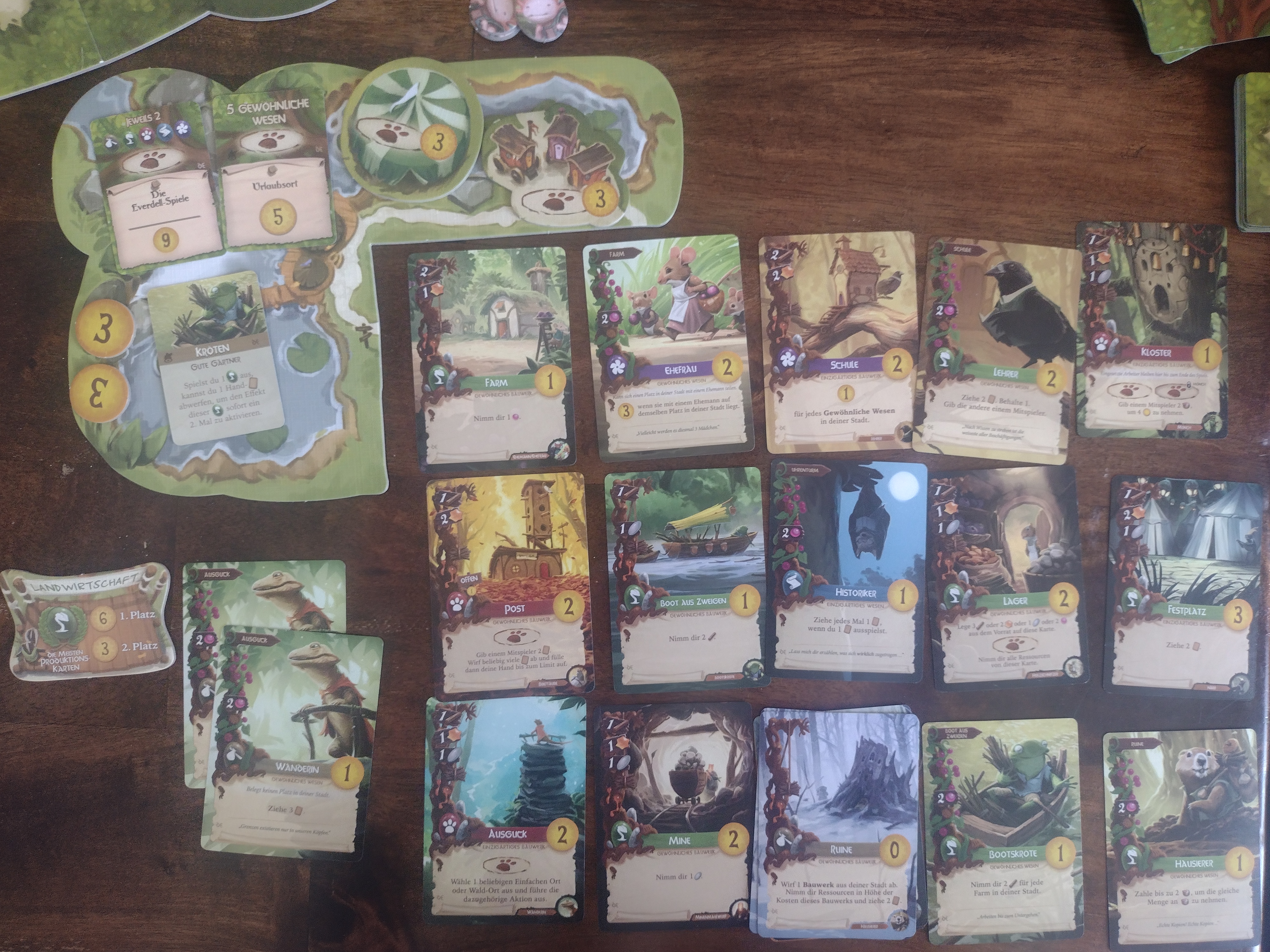 Naja, auch wenn das Ende ein bisschen traurig verlaufen ist, hat's Spaß gemacht. Die Fähigkeit der Kröten hat mir gefallen. Ich hab sie bei 7 von 8 der gespielten Produktionskarten genutzt (lediglich beim Hausierer zum Schluss verzichtete ich darauf) und hatte dadurch nicht wirklich Ressourcenmangel.