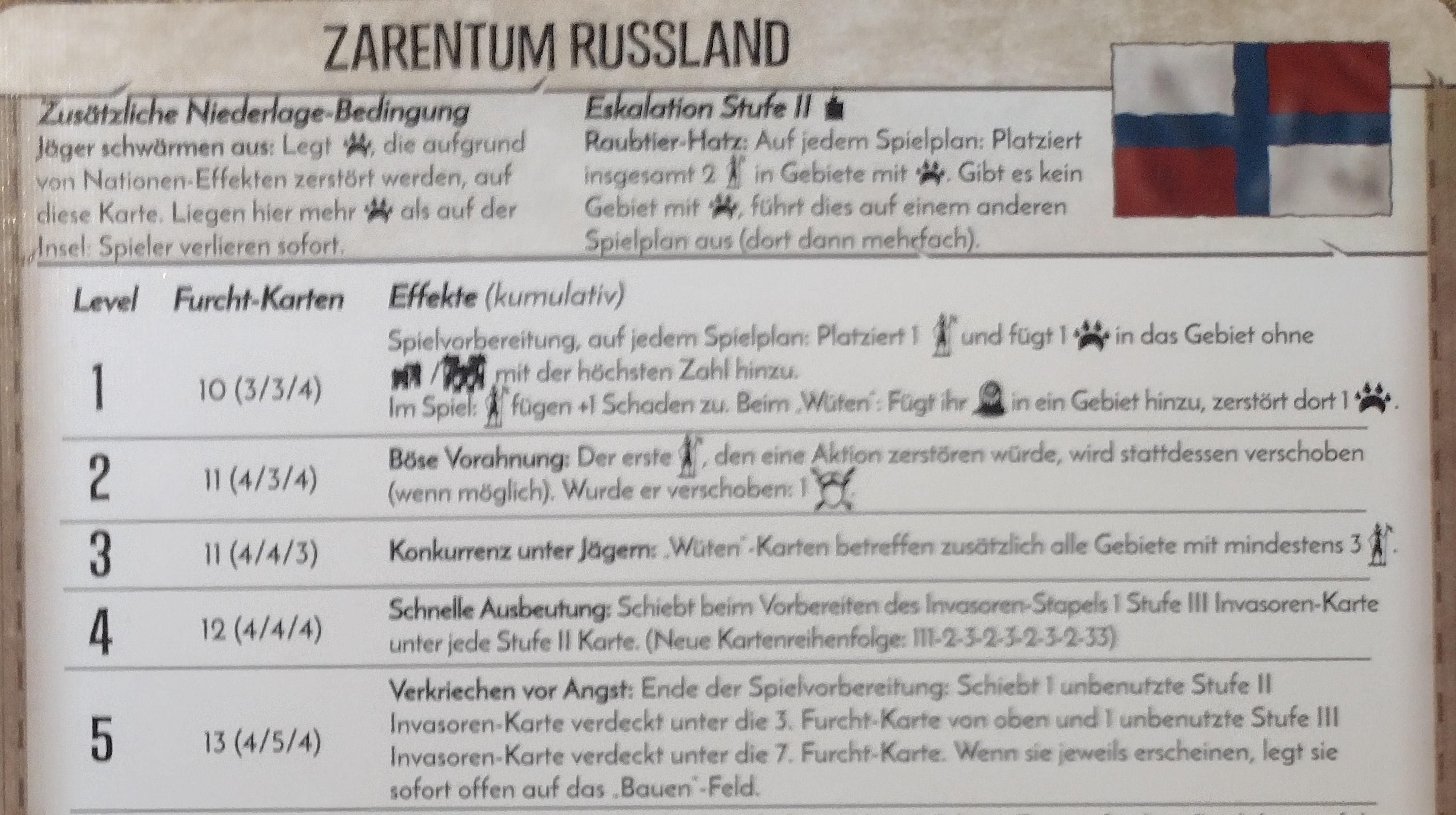 Anm.: Der graue Würfel steht für die Furchtkarten (FK) bis zur nächsten Furchtstufe, während der grüne Würfel für die FK bis zur Stufe-II-Karte (Russland 5) steht.