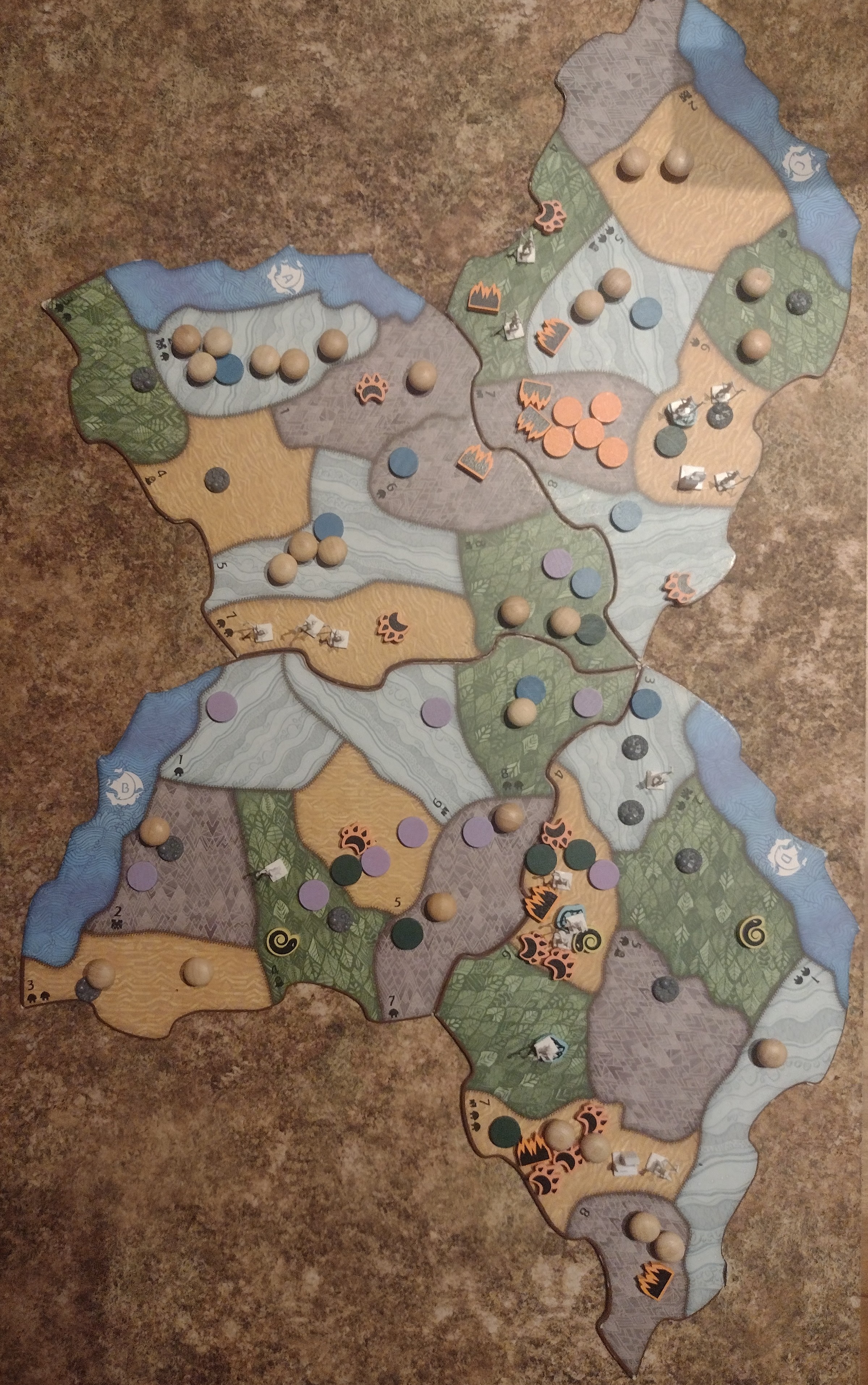 Dann zahlt die Schlange 7 Energie. Das sind genau 66 (!) Schaden, verteilt auf 18 Gebiete. 16 zerstörte Entdecker (einer davon verschoben), 5 zerstörte Dörfer und eine Stadt. 14 Furcht.