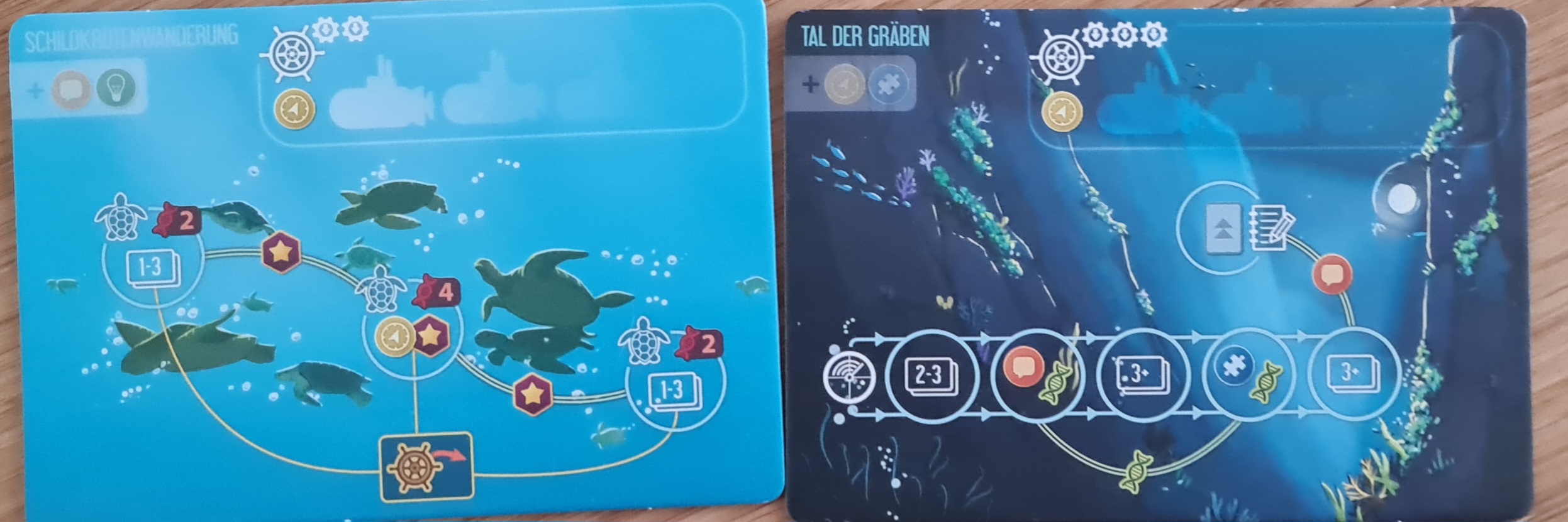 Wenn ich richtig rechne habe ich zu dem Zeitpunkt je 7 Punkte in Rot, Grün und Gelb (8 bräuchte ich jeweils für Level 4) und 3 Punkte in Blau (5 für Level 3), plus den Bonus vom Sonar des Feldforschers. Ich überlege wegen einem Aufstieg in Rot über den letzten Stern (war das Einfluss?), um dann die Ozeanographin zu nehmen. Aber da schauen wir erst Mal, was das Sonar und das Tauchplättchen bringen.