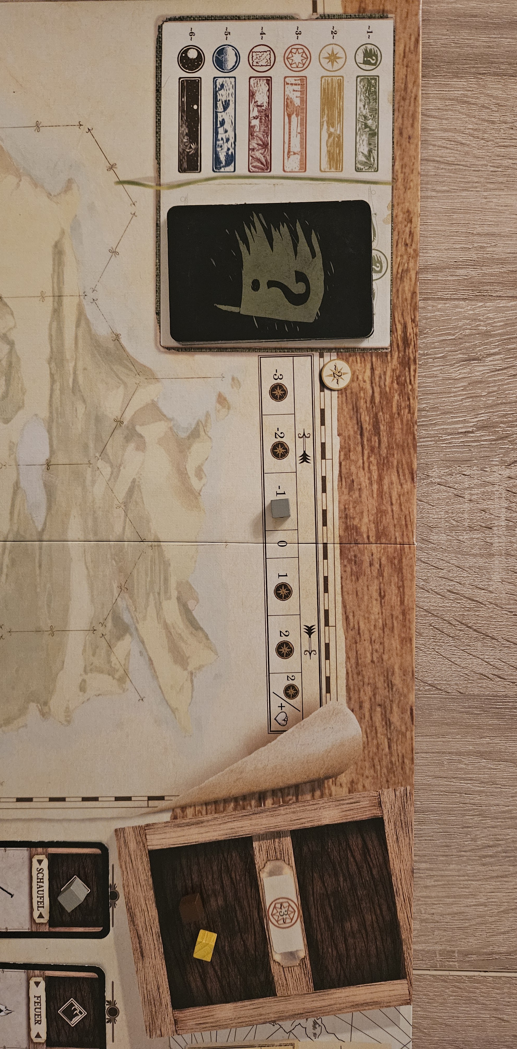 Und hier bereits ein kleiner Fehler: Der graue Marker ist mir leider verrutscht, der sollte bei Spielbeginn auf der 0 liegen und nicht auf der -1.