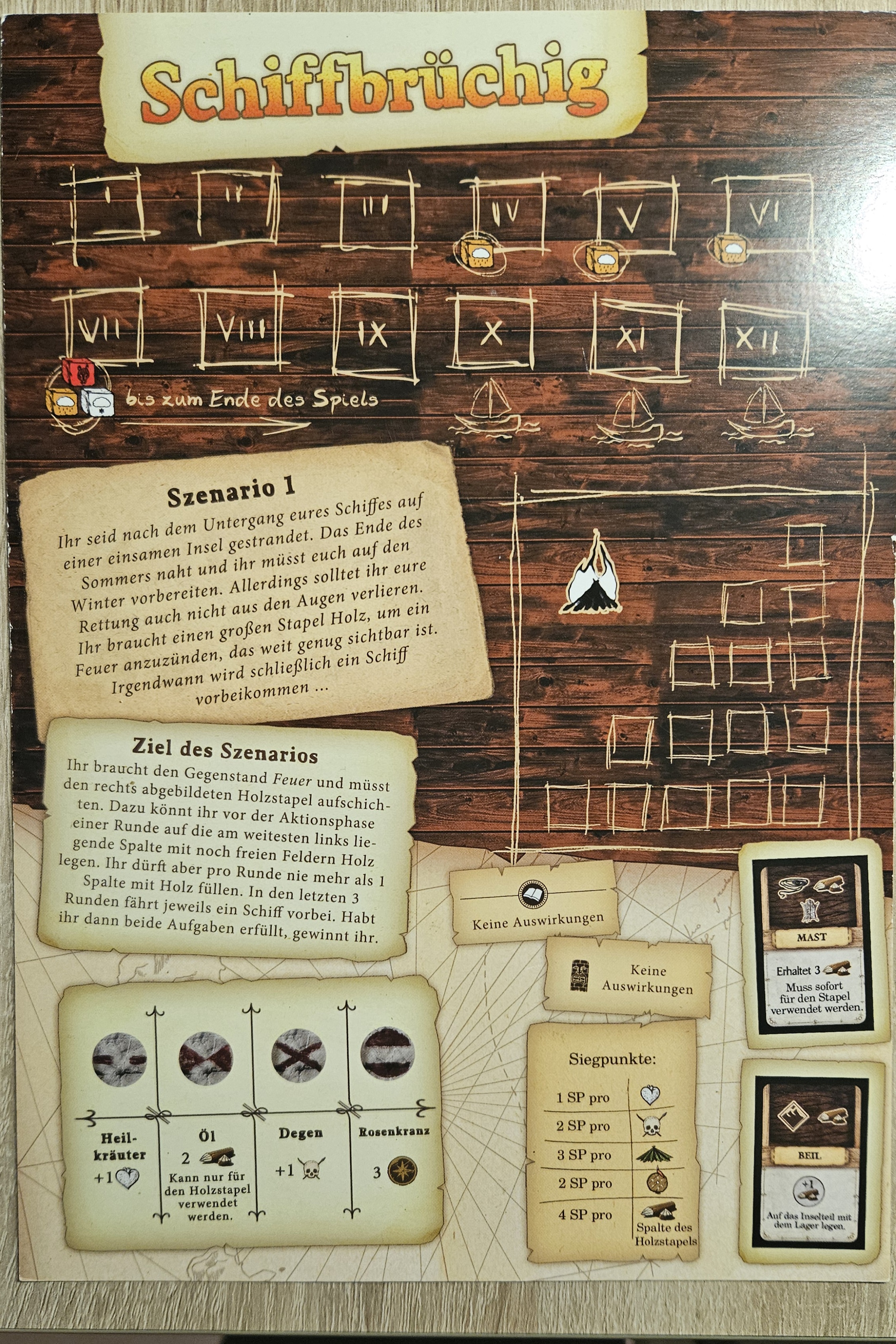 Ganz rechts auf der Charaktertafel wird noch der individuelle Gegenstand erwähnt, den der Charakter bauen kann. Dazu gibt es auch Gegenstandskarten, aber die haben es leider ebenfalls nicht auf das Bild geschafft. Sobald ein Charakter seinen eigenen Gegenstand gebaut hat, erhält er als Belohnung 2 Entschlossenheitsplättchen.