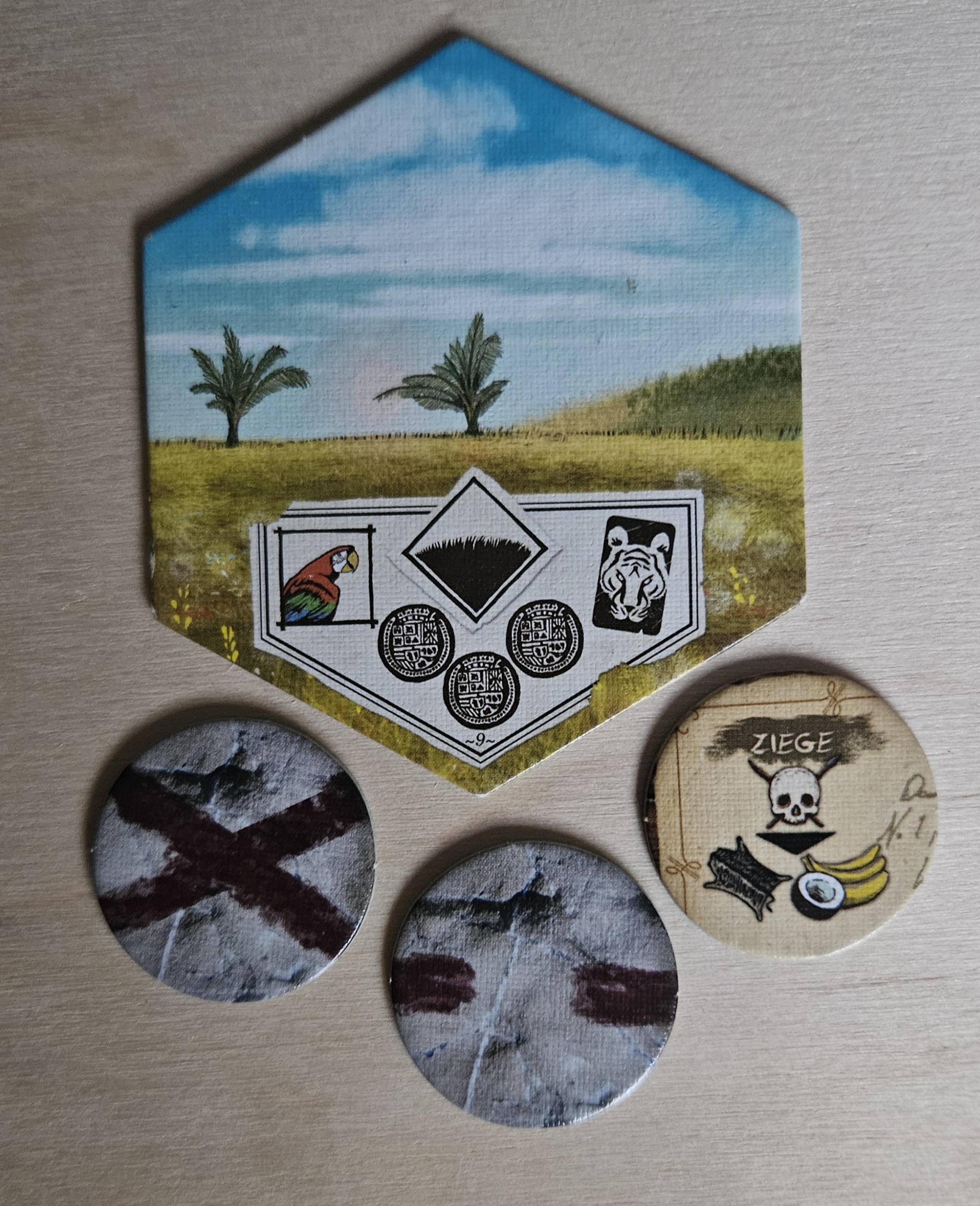 Ludwig war zufrieden mit dem bisher Erreichten und beschloss, zum Lager zurückzukehren. Marie-Catherine hingegen zog es weiter in unerforschte Territorien. Vom Gipfel eines Hügels aus blickte sie in die Ferne in mehrere Gebiete und entschied sich dafür, in eine in eine Steppe jenseits der Hügel mit dem Lager vorzudringen. Auch hier bot ihr ihre selbstgefertigte Karte einen großen Nutzen. In der Steppe entdeckte sie ein wildes Tier (kann aber auf die Entfernung nicht genau erkennen, um was für ein Tier es sich handelt), fand ein paar Heilkräuter (da zeigten sich ihre botanischen Kenntnisse) und stieß plötzlich mit einem Fuß gegen einen herumliegenden Degen (wo immer der auch herkam), den sie natürlich einsteckte.Die Forscherin setzt mit 2 Eps ihre Fähigkeit "Aufklärung" ein und zieht die nächste 3 Inselteile.