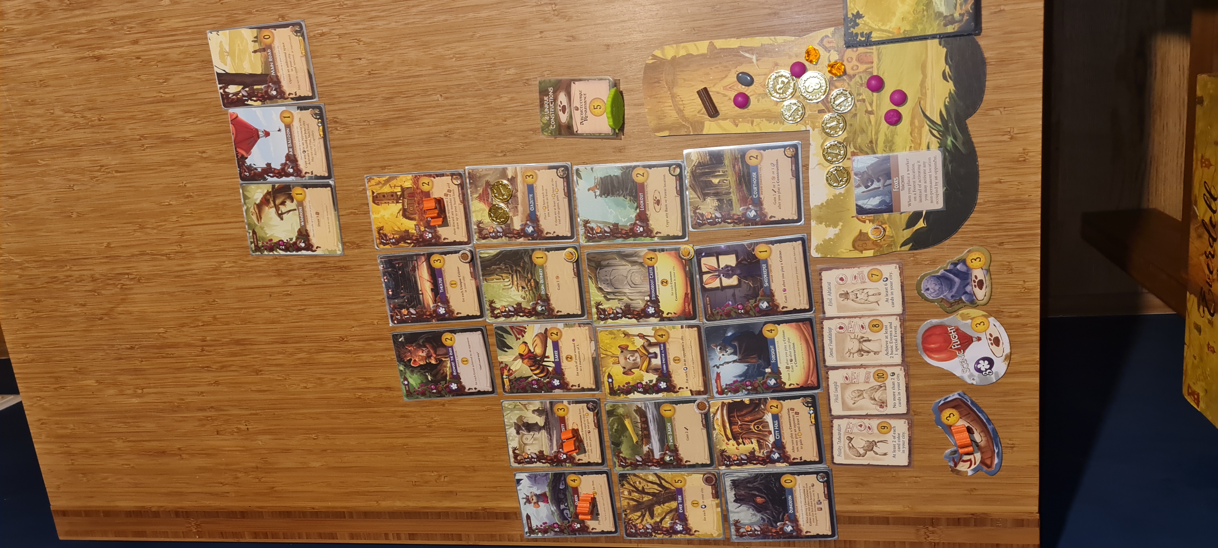 Die Füchse hatten ebenfalls einen richtig guten Sommer, allerdings konnten sie wenige, dafür teure violette Karten bauen. Und mit Ausnahme des Richters, der genau eine Runde zu spät kam, hatten sie Glück, dass sie zuerst den Evertree mithilfe des Verlies bauen konnten, damit die Königin in ihre Stadt holten, damit die Universität kostenlos bauen, damit den leeren Uhrturm abreißen, dafür den Gerichtshof bauen, und dann noch einiges schönes bauen konnten und noch richtig gute Zuggäste begrüßen und ihre Wünsche erfüllen konnten.
