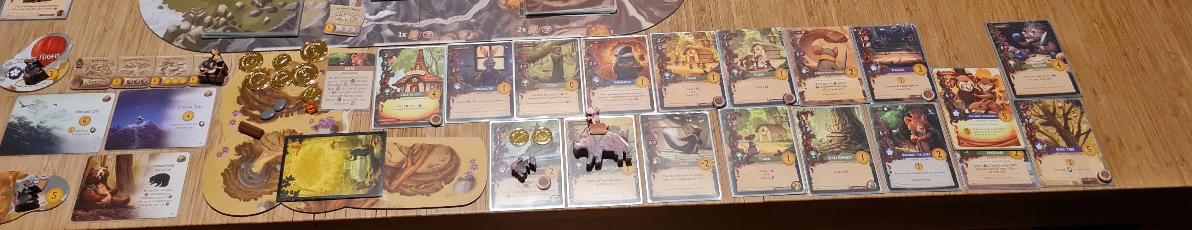 An dieser Stelle kann ich auch noch einen kurzen Everdell-Bericht nachreichen. Am 31.12. spielten wir eine Partie mit unserer "Lieblingskombination", bestehend aus dem Grundspiel, Bellfaire und Spirecrest plus die Legendary Cards sowie die Tickets und die neuen Handkarten aus Newleaf. Es traten an die Frettchen gegen die Starlings.
