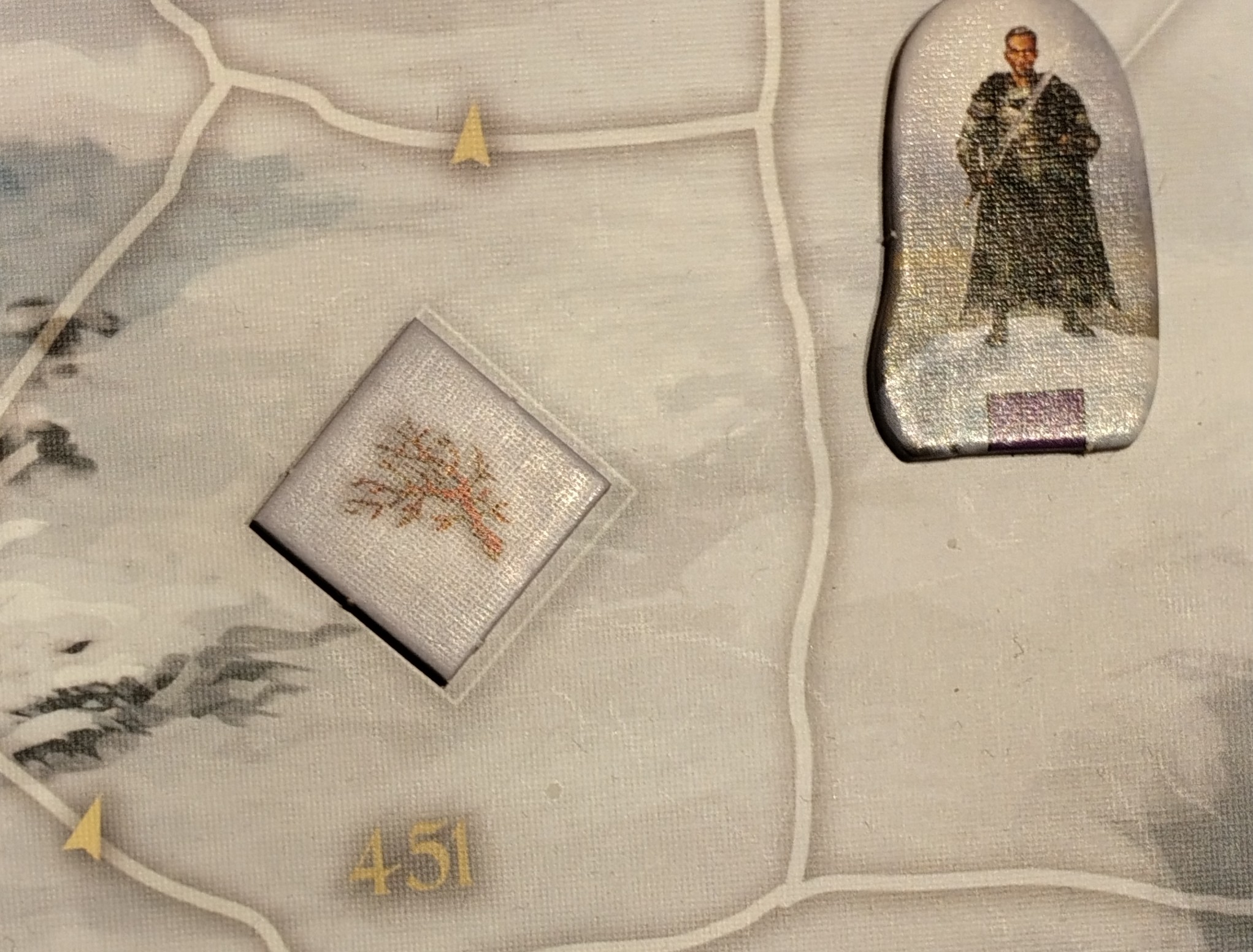 Es sind Zielmarker bei den Grehon, auf auf Feld 438 und in der Pfahlbausiedlung. Wenn wir so ein Feld betreten, wird eine Karte vorgelesen. Der Zielmarker wird dann wie ein Kraut eingesammelt und kann auch mit dem Falken verschickt werden. Wenn ein Held alle drei hat, wieder die Karte „Die Erkenntnis“ vorgelesen.