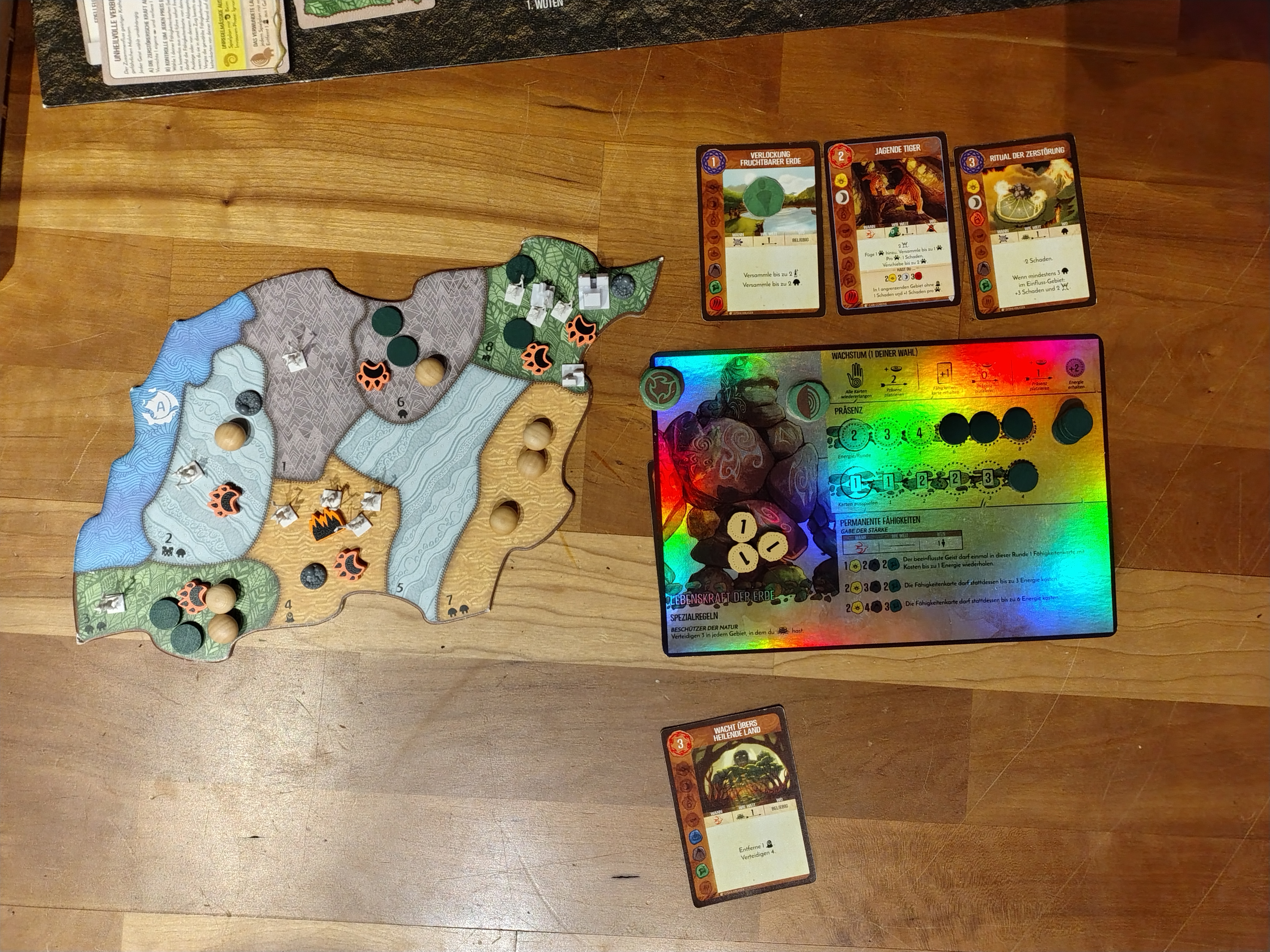 Die Katastrophe mit Ankündigung war in meiner letzten Partie perfekt für die Zunehmende Hitze, da sie Feuer, Luft und Erde als Element hat: die Lebenskraft kann damit halt wenig anfangen. Und die Plättchen muss man erst einmal bekommen, die man mit der Katastrophe braucht, um Schaden zu machen.