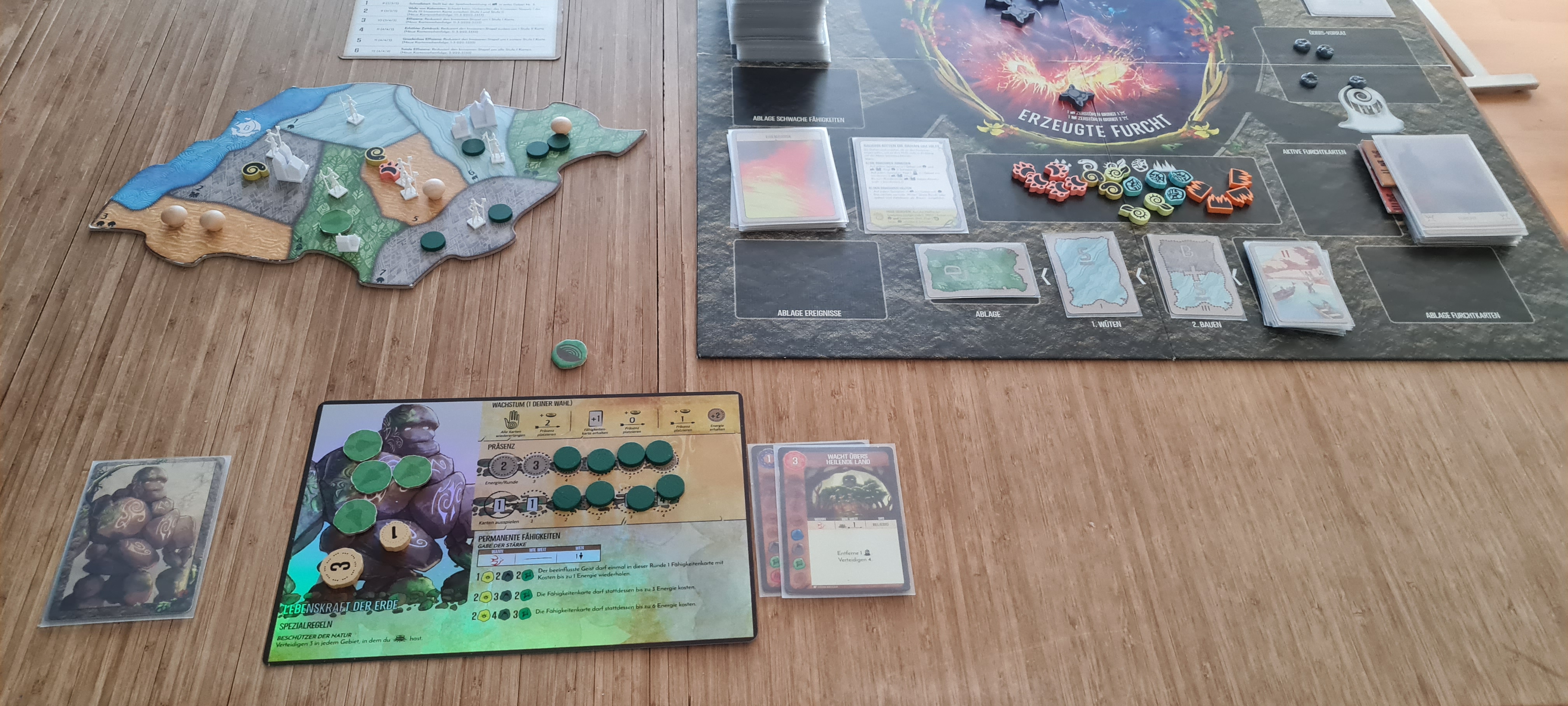Aber gut, am Ende hat's trotzdem gereicht. Das lag vor allem an der Ödniskarte „Alles wird schwächer“, durch die die Invasoren dauerhaft -1 Abwehrkraft haben. Ohne diese Karte wäre ich wahrscheinlich schon an den Wüsten gestorben.