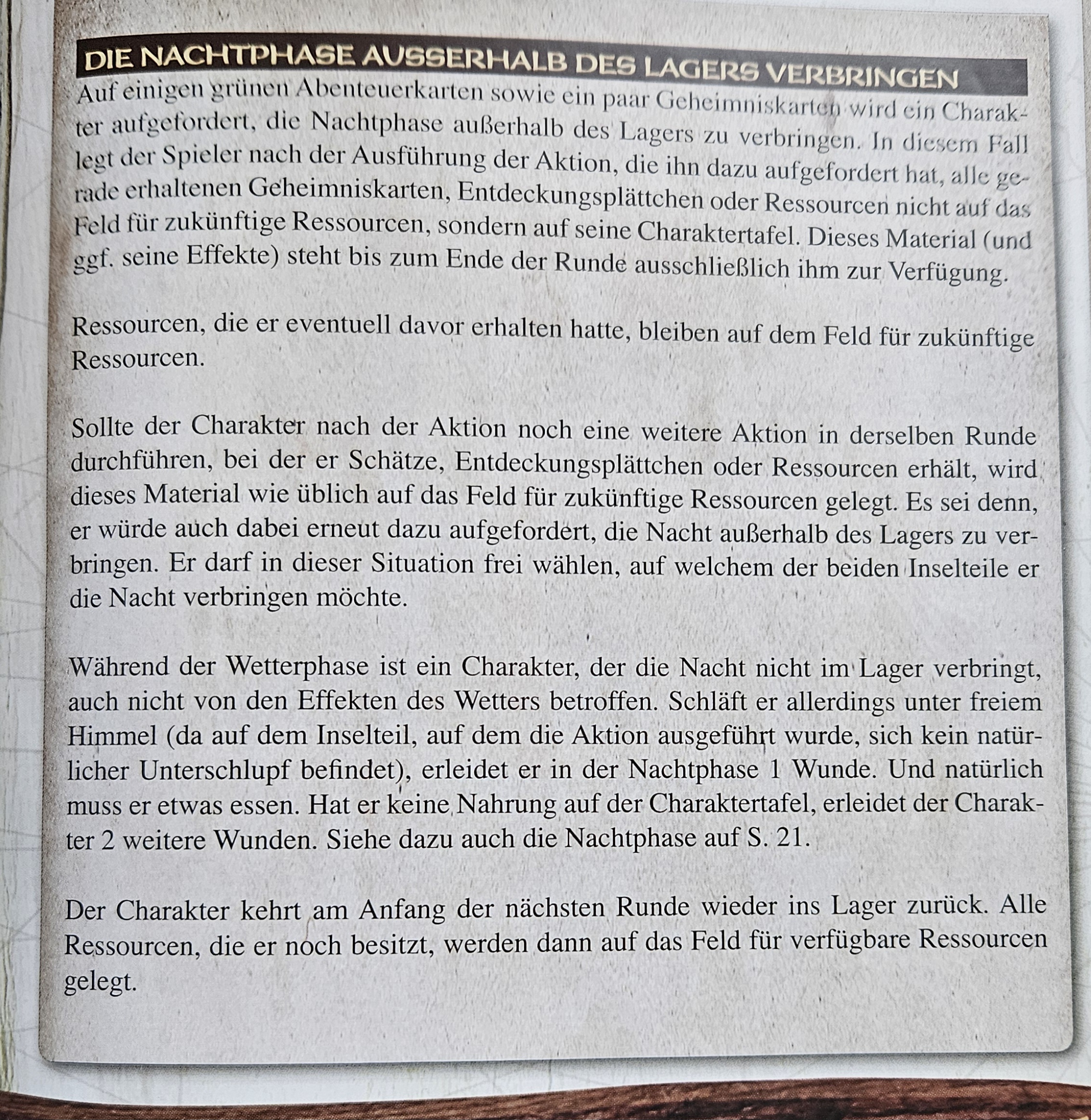 Wir setzen das Tabak-Plättchen ein und erhöhen die Moral um 1 (auf +2). Das Lager wird in die Berge im NO verlegt und alle Charaktere essen etwas. Wir erleiden keine Wunde in der Nachtphase.