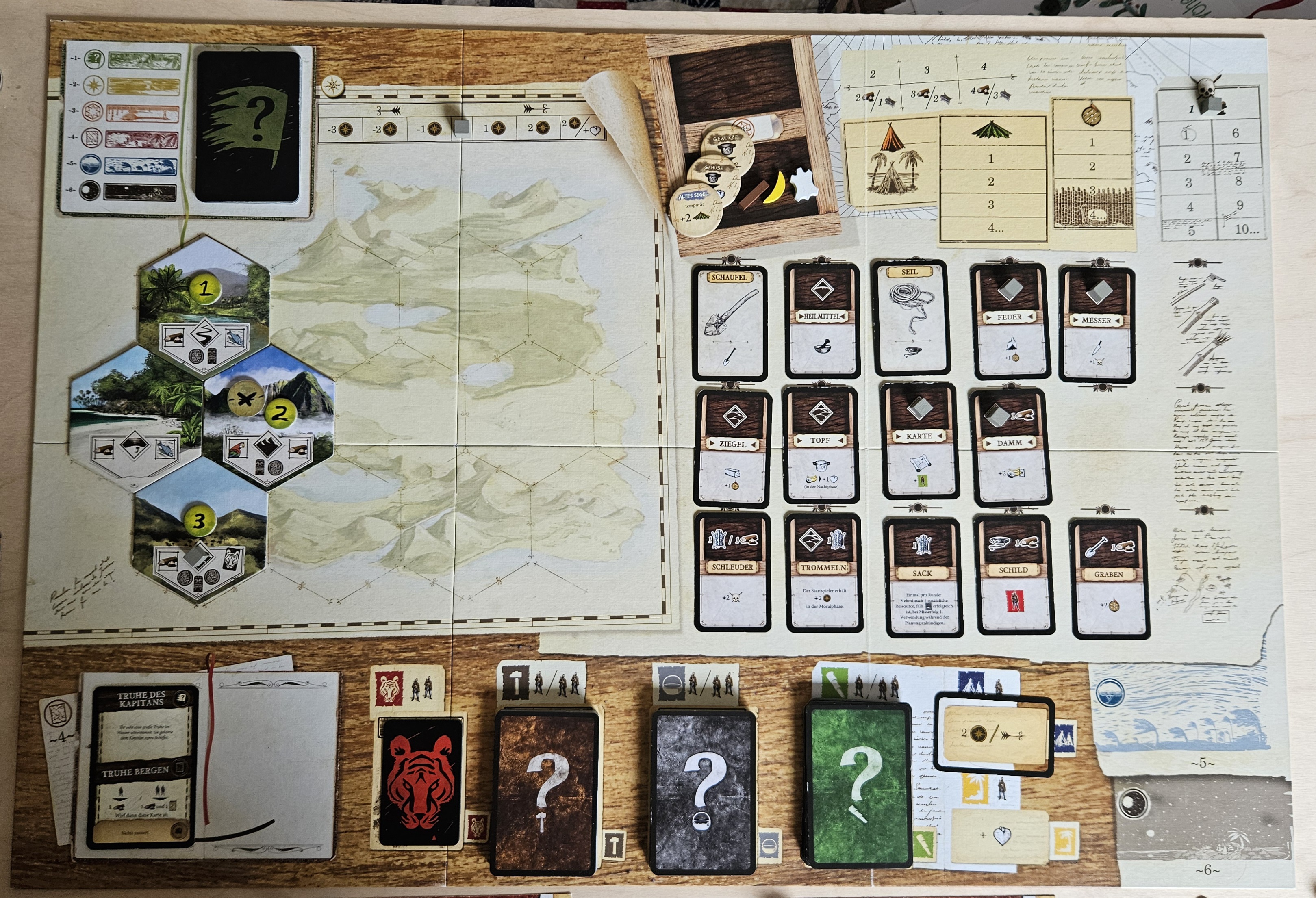 Zusätzlich würde ich jetzt eine neue Erweiterung dazunehmen. Dabei handelt es sich um den "Ausgebauten Unterschlupf" (die großen Plättchen unterhalb der Szenariotafel)