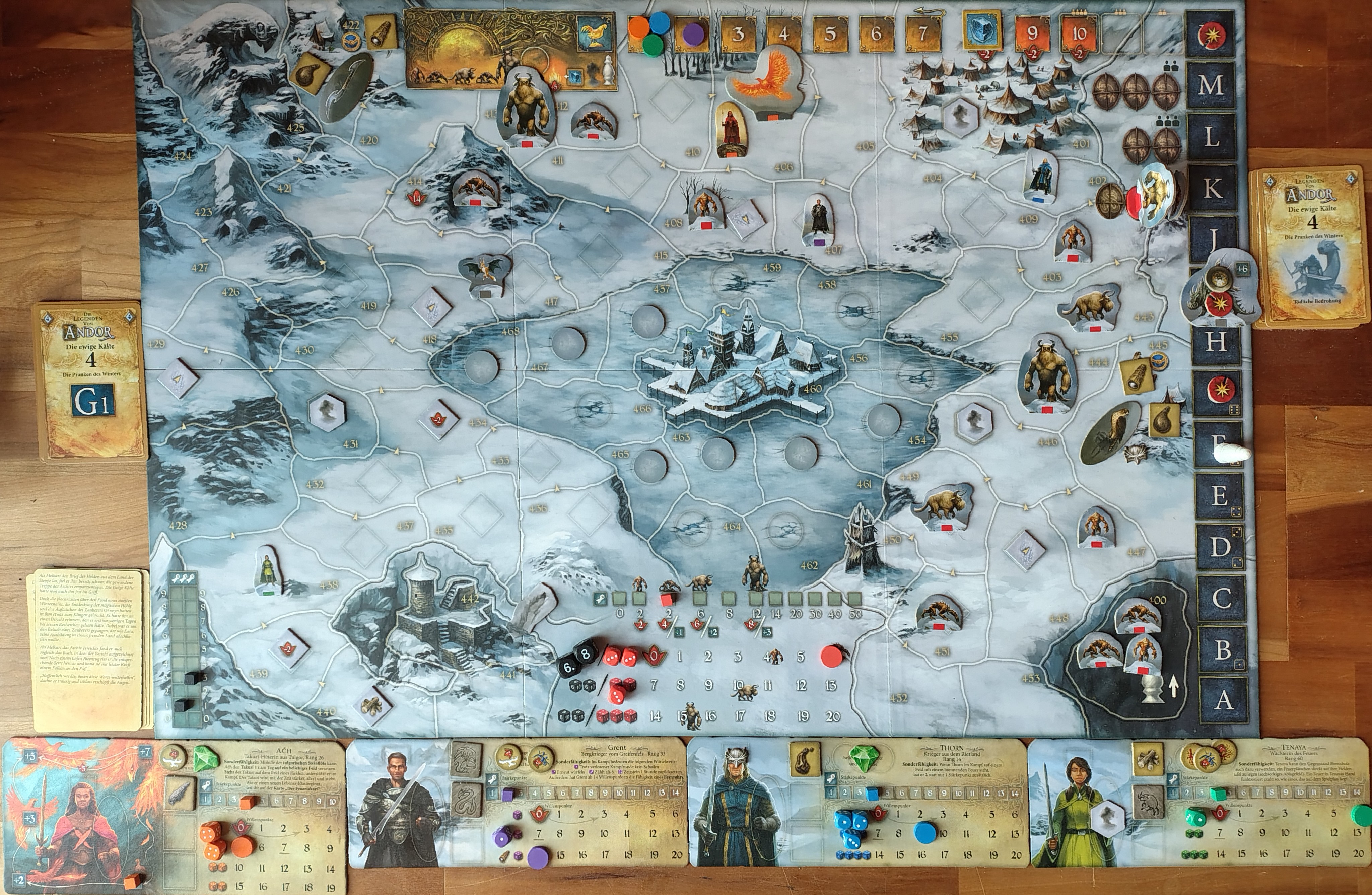 Wenn wir ab jetzt ein Schneeplättchen mit Sternchen aufdecken, wandert die Legendenkarte ein Feld nach unten. Ein Tipp weißt uns darauf hin, dass wir uns besser auf die Bedrohung vorbereiten können, je eher wir wissen, was uns dort erwartet.