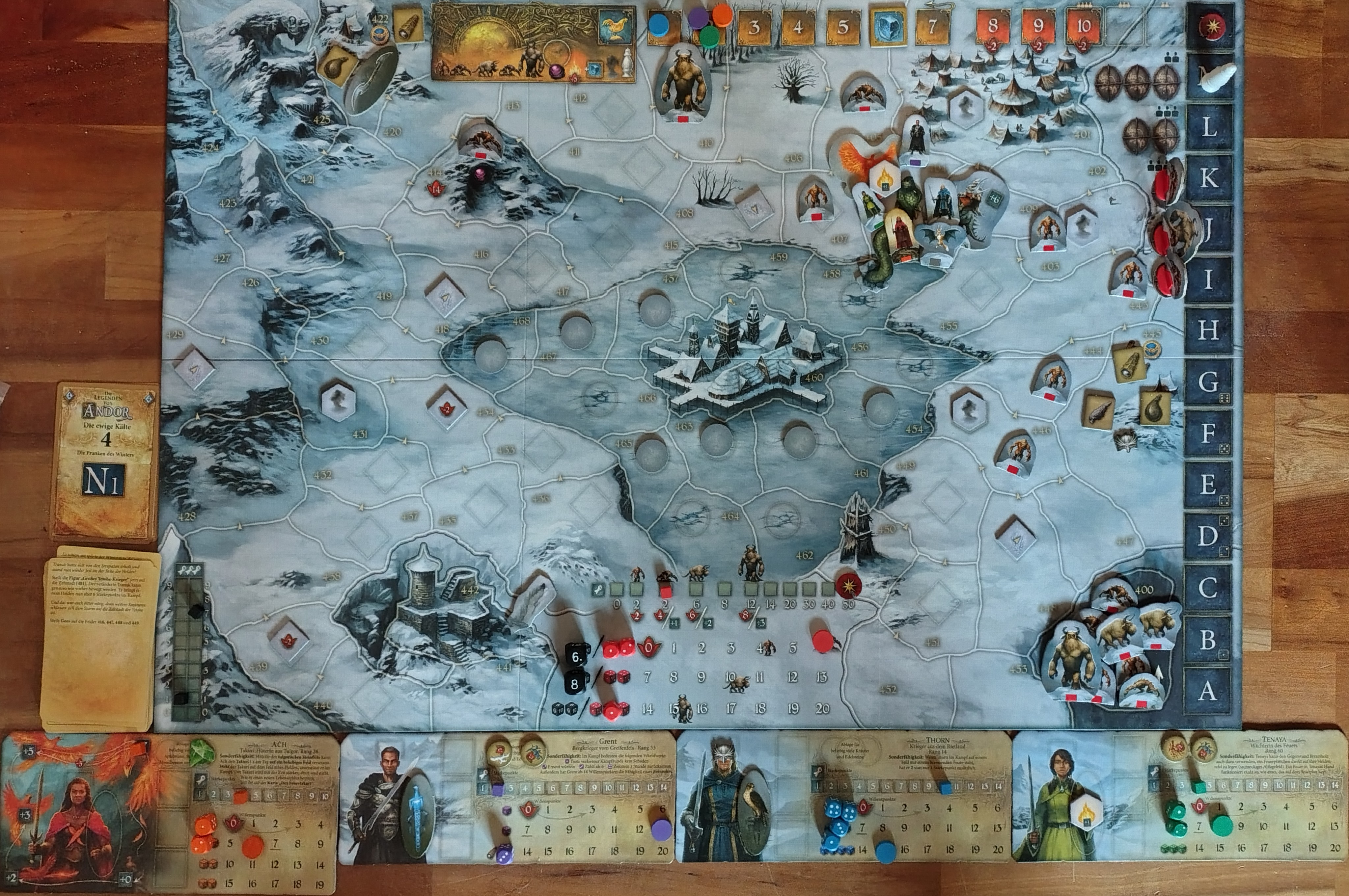 Takota schlängelt sich über den Schnee in Richtung der Zeltstadt. Die durfte sie nicht erreichen! Tenaya stellt sich der riesigen Schlange in den Weg, wird aber einfach zur Seite gefegt (2, 3). Aćh stürmt auf die Schlange zu und gibt Turr ein Zeichen. Der Feuertakuri stürzt sich auf die Schlange und hackt nach den Augen der Schlange. Takota ist abgelenkt und so kann Aćh einen guten Treffer landen (3, 5). Thorn hat sich im Schutze des Feuertakuris unbemerkt der Riesenschlange genähert und schlägt furchtlos nach ihrem Kopf (5, 4, 4, 3). Grent nutzt die Ablenkung ebenfalls und trifft die Schlange mit seinem Schwert (5).