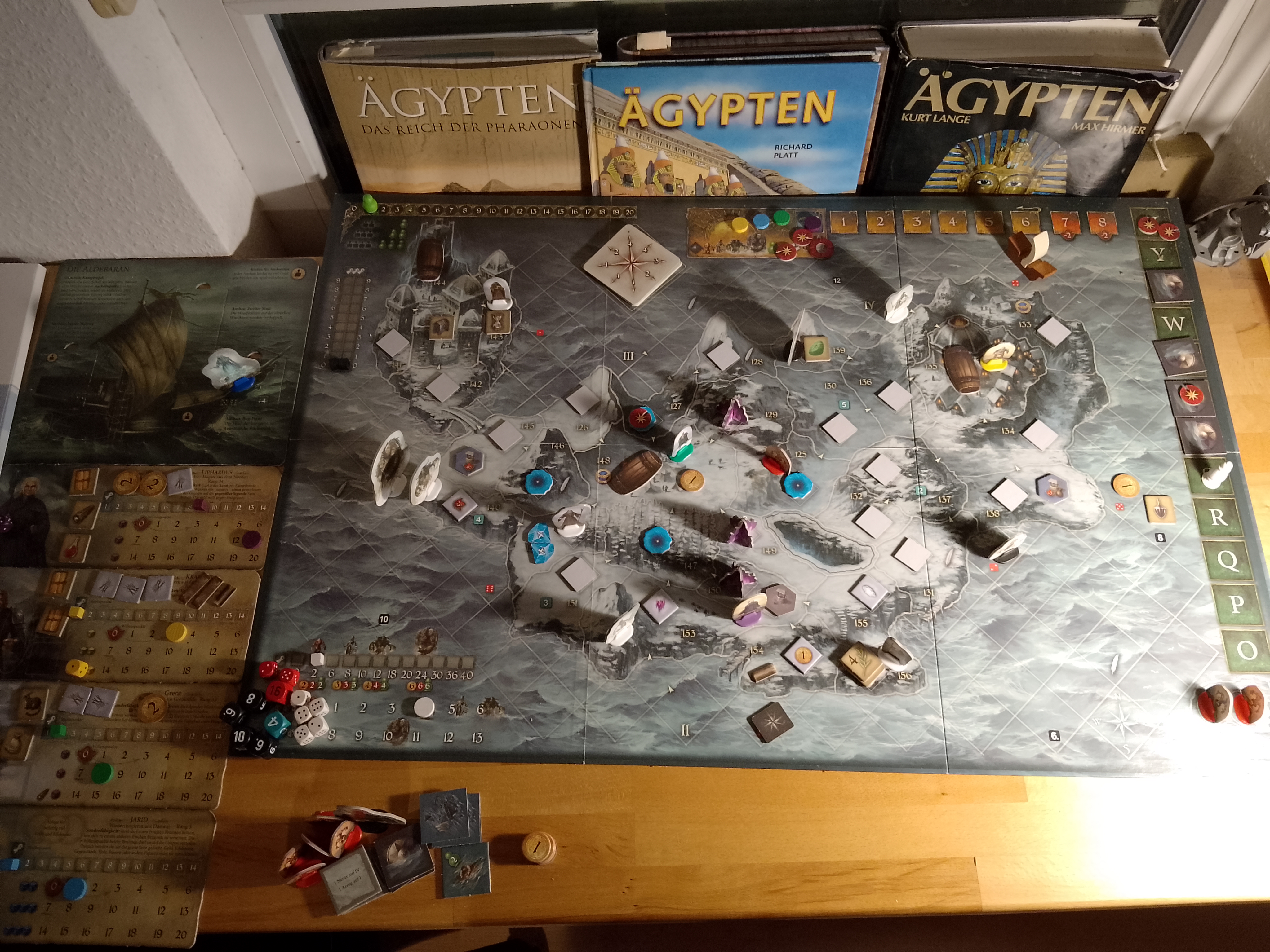 Ein Sturm kostet Bilgram 2 WP und versetzt das Schiff zur roten 4, dann folgt angenehmer Wind (3,2,2,3,1,1,4,3).