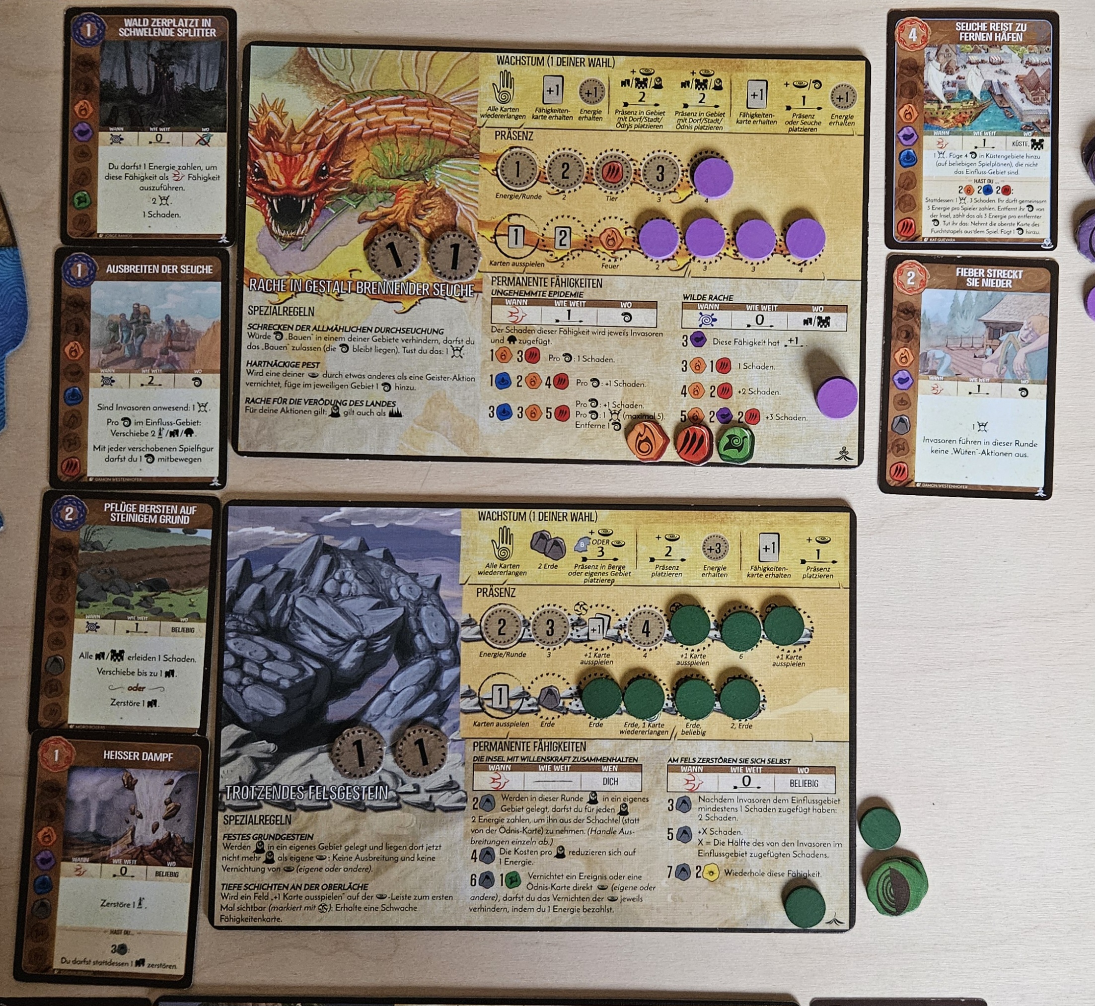 Ich setze eine Präsenz von der unteren Leiste (für 3 Karten) nach D8, erhalte 3+1 Energie und setze eine Vernichtete Präsenz nach A6. Bei den Elementen wähle ich wieder das Tier-Element, vernichte eine Präsenz in A2, versammle eine Ödnis aus C7 in D8 und spiele die beiden verbliebenen Karten aus.