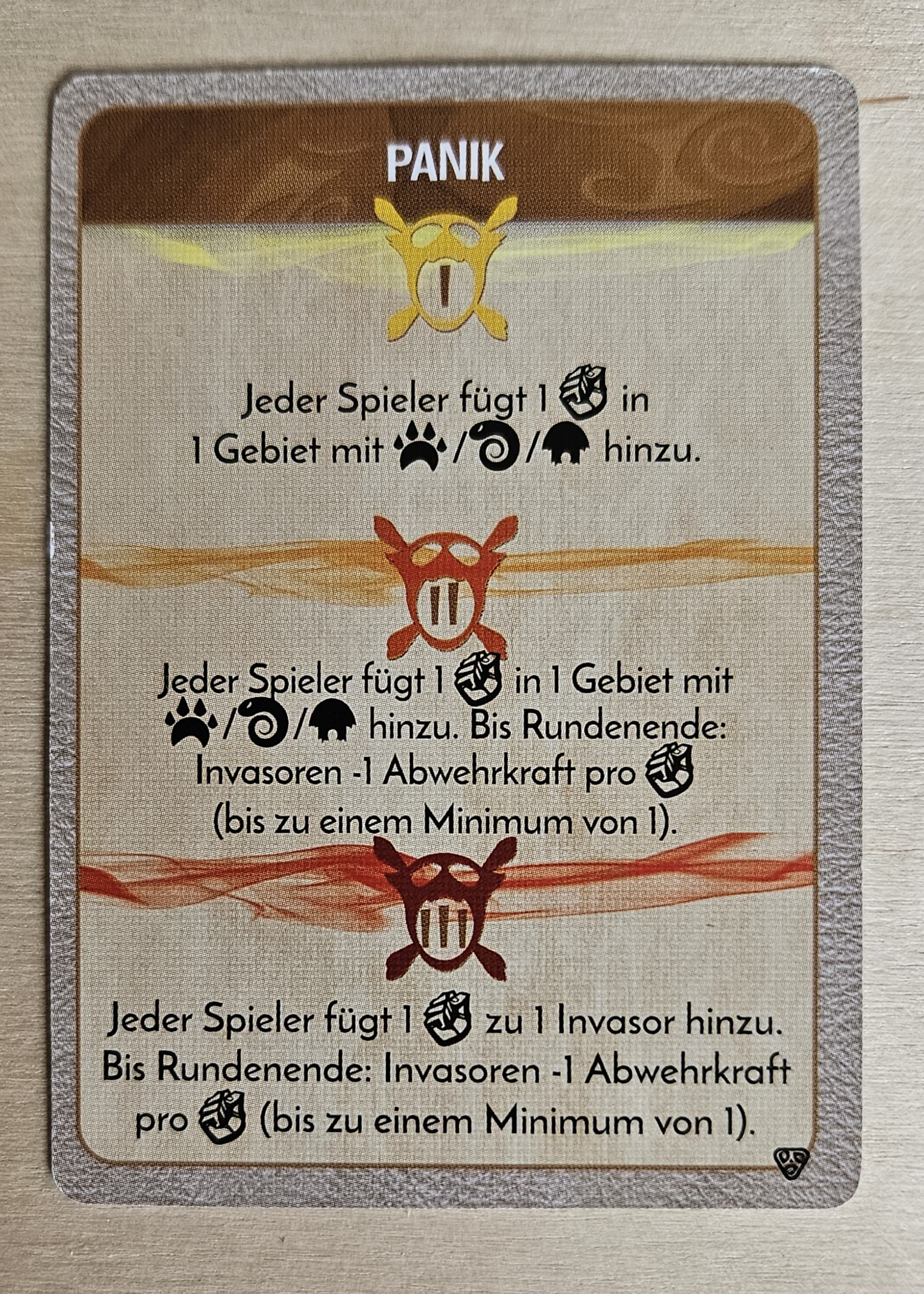 Ungehemmte Epidemie auf B6, mit 4 Tier, 3 Feuer und 2 Wasser: 4+4+2(Ödnis) Schaden, zerstört Stadt, 2 Dörfer und 2 Entdecker, +4 Furcht.