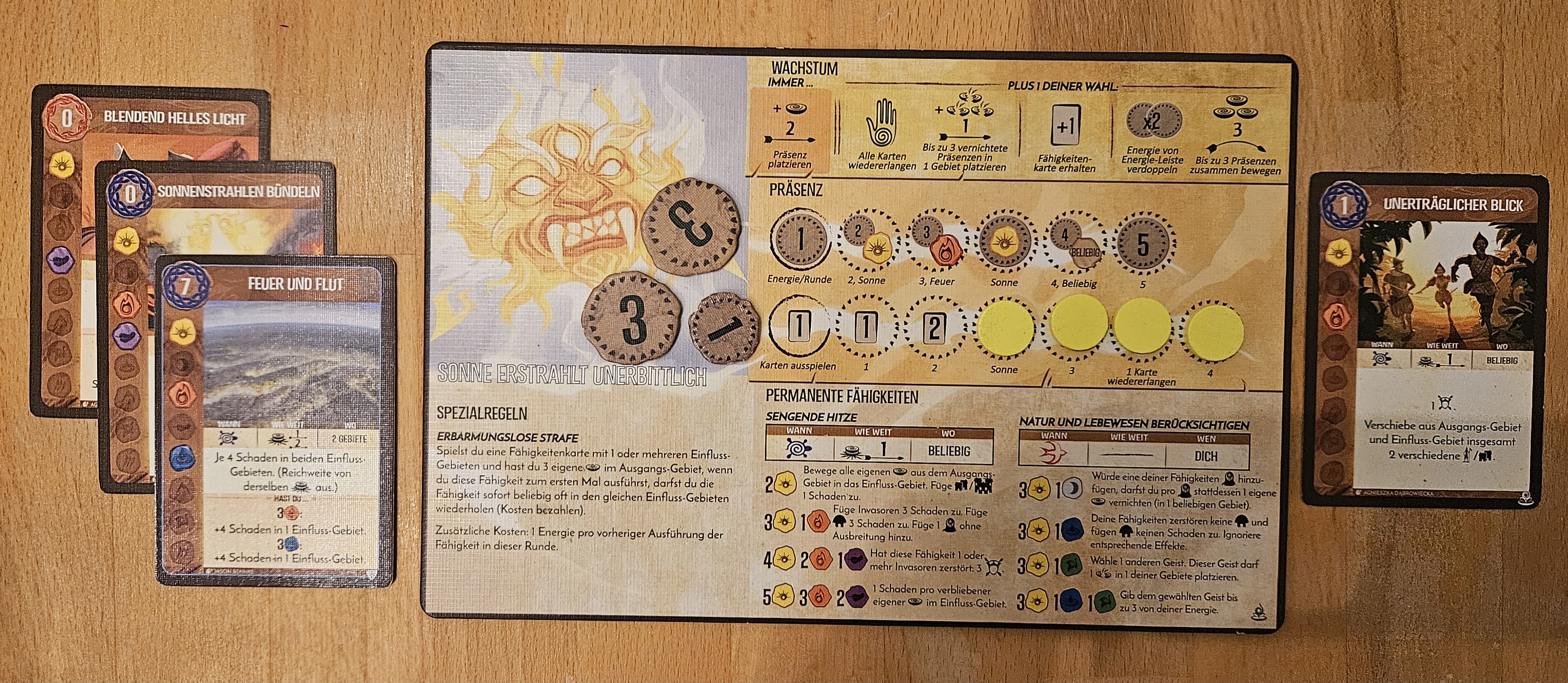 Wüten: In NW2 wüten die drei Dörfer mit 6 Schaden bei 6 Verteidigung (Karte "Seehandel flaut ab"). Also passiert nichts. In NW9 wird mit 3 verteidigt (bei 3 Schaden). Anschließend zerstört der Dahan das Dorf. +1 Furcht