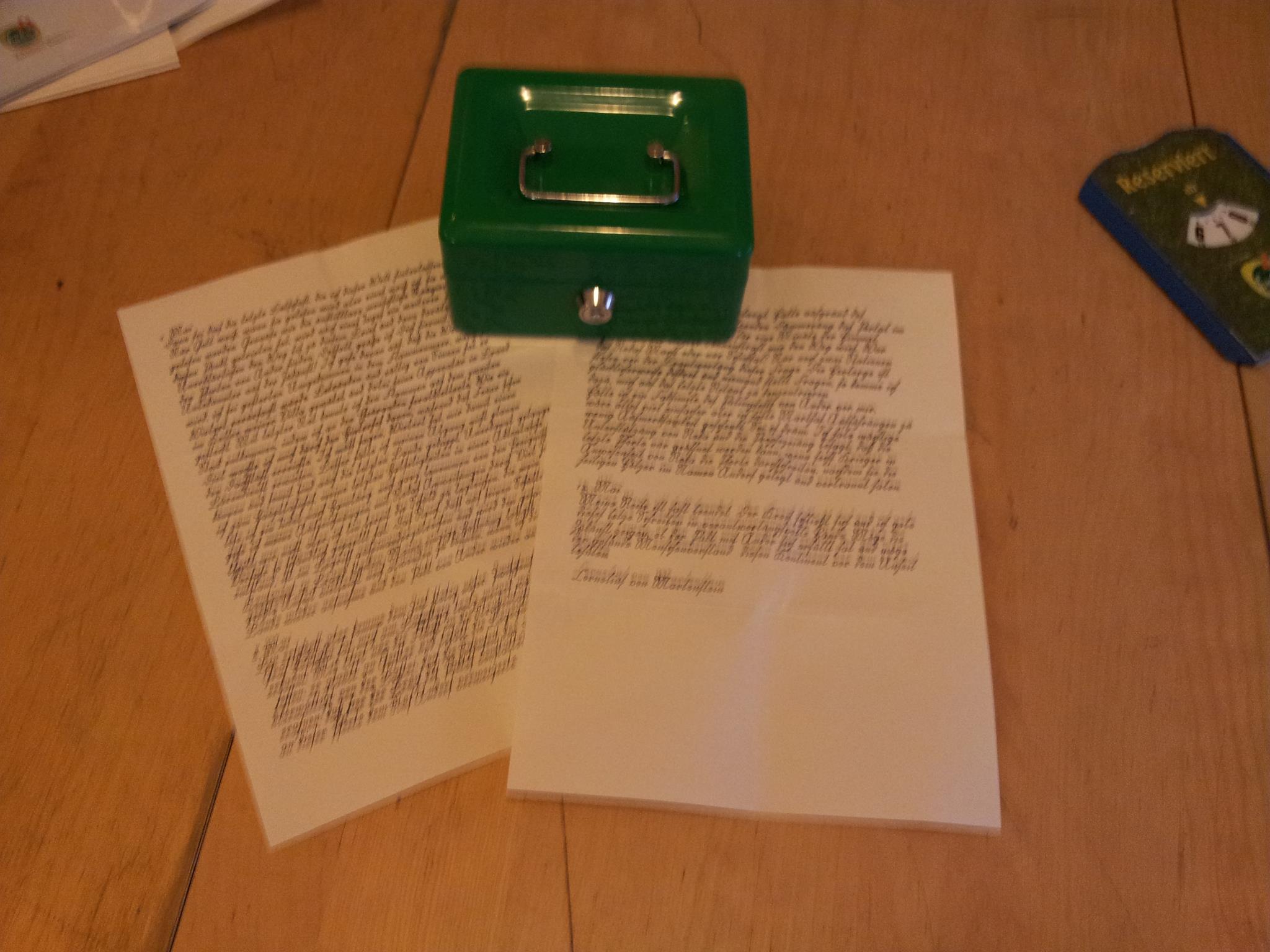 So, ein Statusupdate aus Berlin: Andrea Neumann hat wie gesagt eine Geldkassette an den Koordinaten in den Büschen gefunden und hier in die Spielwiese gebracht. Ihr Freund besitzt eine ähnliche Geldkassette, die sich mit einem Schlüssel öffnen läßt, der bis auf die eingeprägte Nr. identisch ist (064 statt 044) und siehe da, er hat gepasst. Drinnen war ein Umschlag mit 2 Briefseiten in Sütterlin. Detailliertere Fotos von der Bergung und Scans des Briefes gibt es heute Nacht direkt von Andrea.