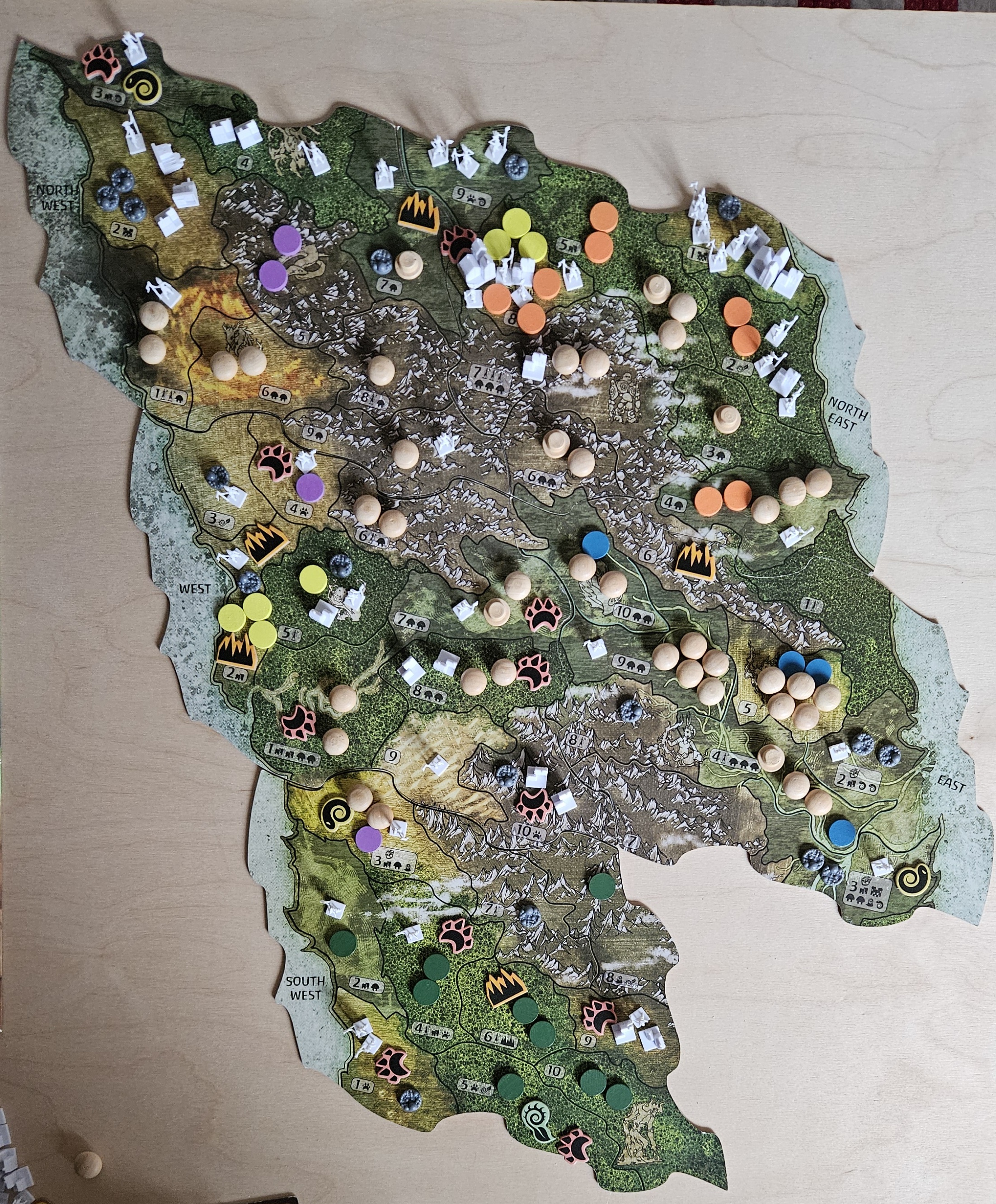 Ödnis-Marker: 23 verbleibend.) In NO2 herrscht das "Jahr absoluter Stille". Damit wird zweimal das Wüten verhindert. In NO3 zerstört der Dahan den verbliebenen Entdecker (vorher gibt es 1 Schaden gegen 6 Verteidigung). In NO6 machen Dorf und Entdecker 0+1 Schaden und werden anschließend zerstört. +1 Furcht (