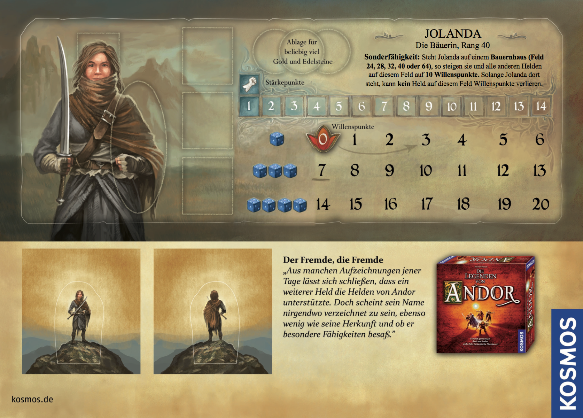Jolandas Sonderfähigkeit erinnert mich an die Feuerholz-Plättchen in Hadria. Dass die Helden nie WPs verlieren können, erscheint mir etwas krass. Ich würde sagen, während einer Kampfrunde oder wenn die Zeitsteine auf dem Sonnenaufgang-Feld sind, gilt das nicht. Aber wenn die Helden auf den Bauernhöfen WPs verlieren, können sie sie ja wieder zurückbekommen, wenn sie wieder/immer noch auf einem Bauernhof sind. Außerdem finde ich diejenigen Helden allgemein etwas blöd, die man nicht in allen drei Teilen verwenden kann. Aber kein Grund, Jolanda aufzugeben, sie erscheint mir recht ausgewogen und spielbar (mit meinen Korrekturen).