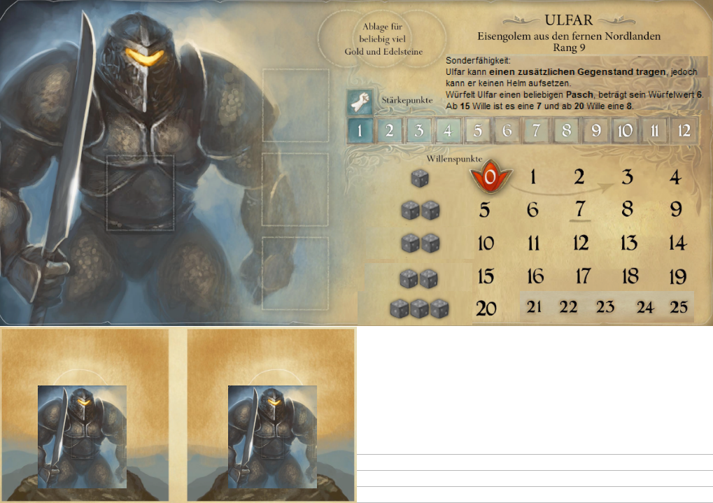 Die + 2 SP im Kampf alleine, bzw. die +1 SP im Gruppenkampf könnte man mMn weglassen, da er dadurch nochmals erheblich stärker wird, als er ohnehin schon ist (trotz des fehlenden zweiten Ablagefelds). Wotan wird im Verlaufe einer Grundspiel-Legende ohne erhöhte Kreaturenstärke wohl zunächst einen Gor und später einen Skral alleine besiegen. Letzterer gibt ihm dann bereits +6 SP. Mehr wäre Overkill.