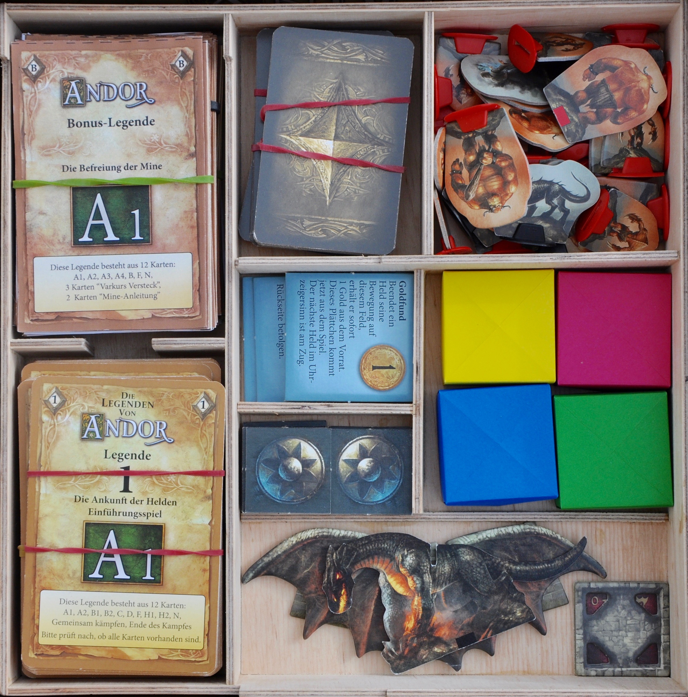 schon seit längerem beschäftige ich mich mit der Frage, wie ich meine Andor-Teile am besten sortiere. Deshalb habe ich jetzt ein Inlay für das Grundspiel und für die Reise in den Norden aus Holz gebaut, und weil ich kein passendes Thema gefunden habe, eröffne ich jetzt einfach ein neues. Vielleicht hat ja jemand ein ähnliches Vorhaben wie ich und kann die Bilder als Inspiration nutzen.