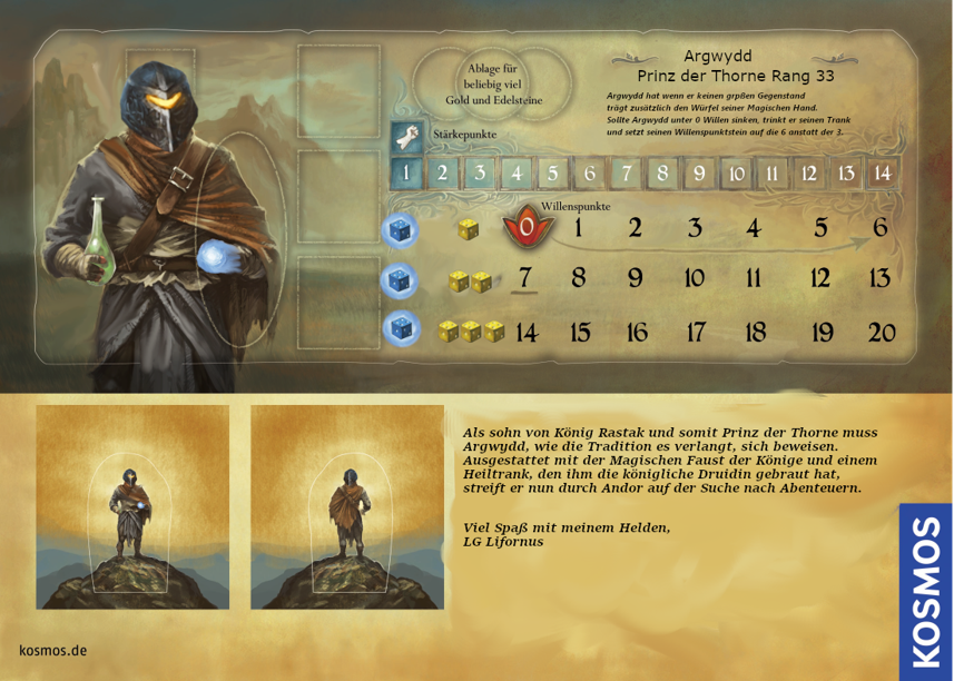 Hintergrund: Als Sohn von König Rastak und somit Prinz der Thorne muss Argwydd, wie die Tradition es verlangt, sich beweisen. Ausgestattet mit der Magischen Faust der Könige und einem Heiltrank, den ihm die königliche Druidin gebraut hatte, streift er nun durch Andor auf der Suche nach Abenteuern.