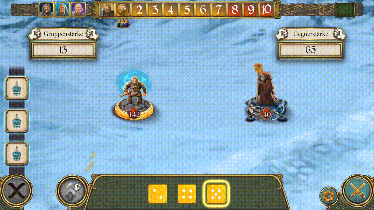 In Kampfrunde 1 (Zeitstein von 1 auf 7, das Licht der fünften Stunde wird ausgelöst) haben die Helden einen Kampfwert von 10 SP (Aćh) +14 SP (Forn) +12 SP (Iril) +14 SP (Darh) +14 SP (Orfen) +7 (Orfens Trollbonus) +14 SP (Thorn) +14 (Lonas) +14 (Rutan) +14 (Merla) +7 (Turr) +6 (Knochen-Golem) +5 (Licht der fünften Stunde) +12 (Aćhs großer schwarzer Würfel) +18 (Forns Pasch) +8 (2 Heilkräuter) +5 (Iril dreht ihre Runenscheibe um 3 Speichen auf den 5-Brunnen) +5 (Trank der Hexe) +18 (Darhs Pasch) +4 (2 Messer) +18 (Orfens Pasch) +4 (Kampfaxt) +24 (Thorns Pasch) = 261.
